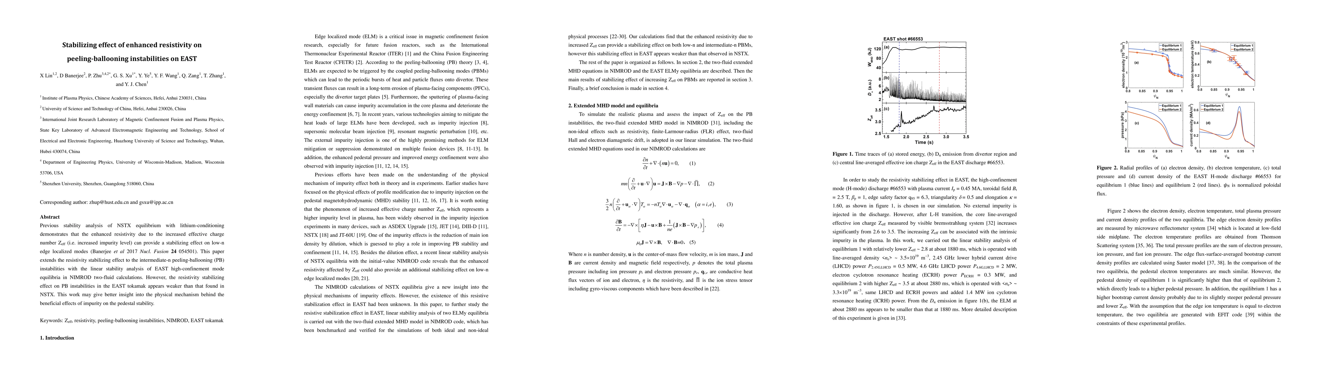 Previous stability analysis of NSTX equilibrium with lithium-conditioning demonstrates that the enhanced resistivity due to the increased effective charge number Zeff (i.e. increased impurity level) can provide a stabilizing effect on low-n edge localized modes (Banerjee et al 2017 Nucl. Fusion 24 054501). This paper extends the resistivity stabilizing effect to the intermediate-n peeling-ballooning (PB) instabilities with the linear stability analysis of EAST high-confinement mode equilibria in NIMROD two-fluid calculations. However, the resistivity stabilizing effect on PB instabilities in the EAST tokamak appears weaker than that found in NSTX. This work may give better insight into the physical mechanism behind the beneficial effects of impurity on the pedestal stability.