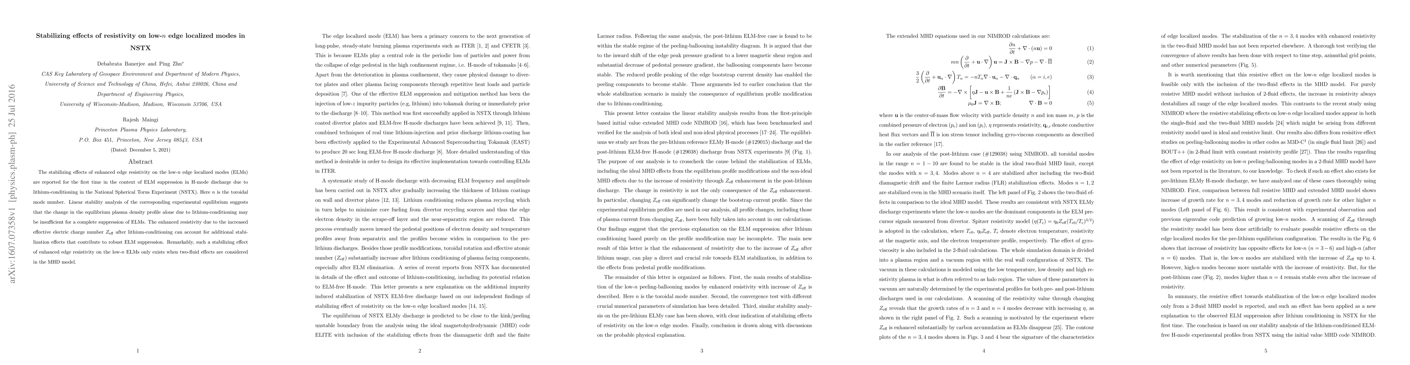 This paper reports that enhanced edge resistivity from Lithium-conditioning in NSTX can stabilize low-n edge localized modes (ELMs), with the stabilizing effect attributed to increased effective electric charge number Z eff. The study finds that two-fluid effects in the MHD model are crucial for this stabilization.