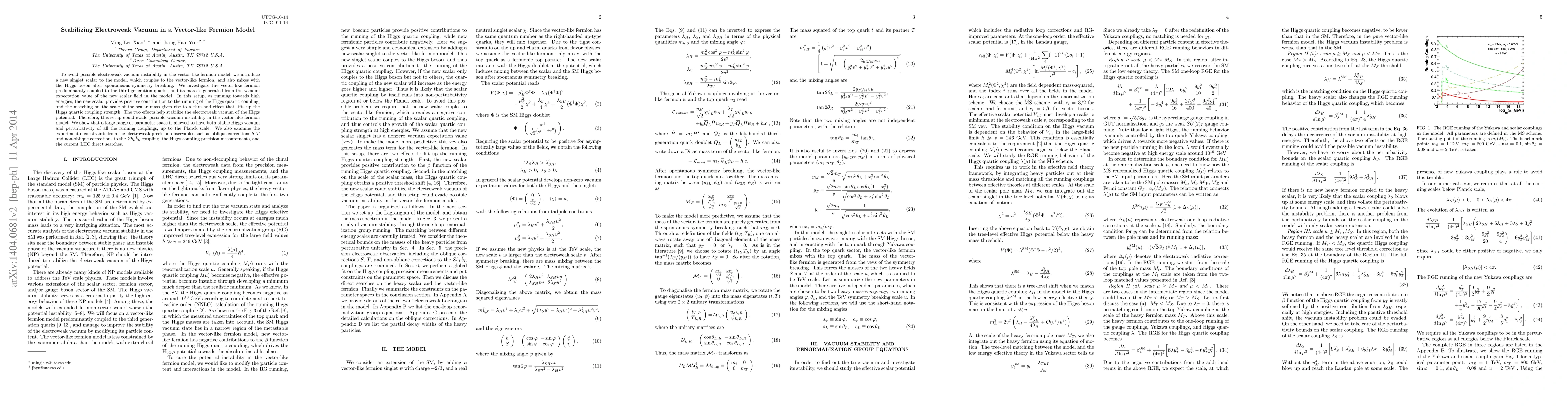 This paper proposes a vector-like fermion model with a new singlet scalar to stabilize the electroweak vacuum, showing that the new scalar's coupling and mixing effects can prevent vacuum instability and maintain perturbativity up to the Planck scale, while also complying with experimental constraints from precision observables and LHC searches.