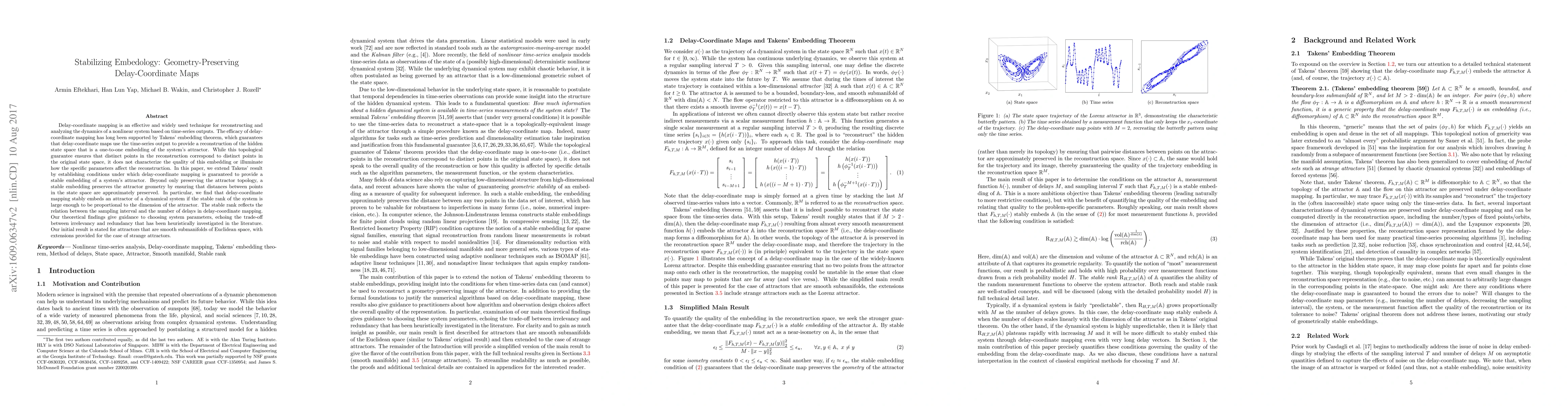 Delay-coordinate mapping is an effective and widely used technique for reconstructing and analyzing the dynamics of a nonlinear system based on time-series outputs. The efficacy of delay-coordinate mapping has long been supported by Takens' embedding theorem, which guarantees that delay-coordinate maps use the time-series output to provide a reconstruction of the hidden state space that is a one-to-one embedding of the system's attractor. While this topological guarantee ensures that distinct points in the reconstruction correspond to distinct points in the original state space, it does not characterize the quality of this embedding or illuminate how the specific parameters affect the reconstruction. In this paper, we extend Takens' result by establishing conditions under which delay-coordinate mapping is guaranteed to provide a stable embedding of a system's attractor. Beyond only preserving the attractor topology, a stable embedding preserves the attractor geometry by ensuring that distances between points in the state space are approximately preserved. In particular, we find that delay-coordinate mapping stably embeds an attractor of a dynamical system if the stable rank of the system is large enough to be proportional to the dimension of the attractor. The stable rank reflects the relation between the sampling interval and the number of delays in delay-coordinate mapping. Our theoretical findings give guidance to choosing system parameters, echoing the trade-off between irrelevancy and redundancy that has been heuristically investigated in the literature. Our initial result is stated for attractors that are smooth submanifolds of Euclidean space, with extensions provided for the case of strange attractors.