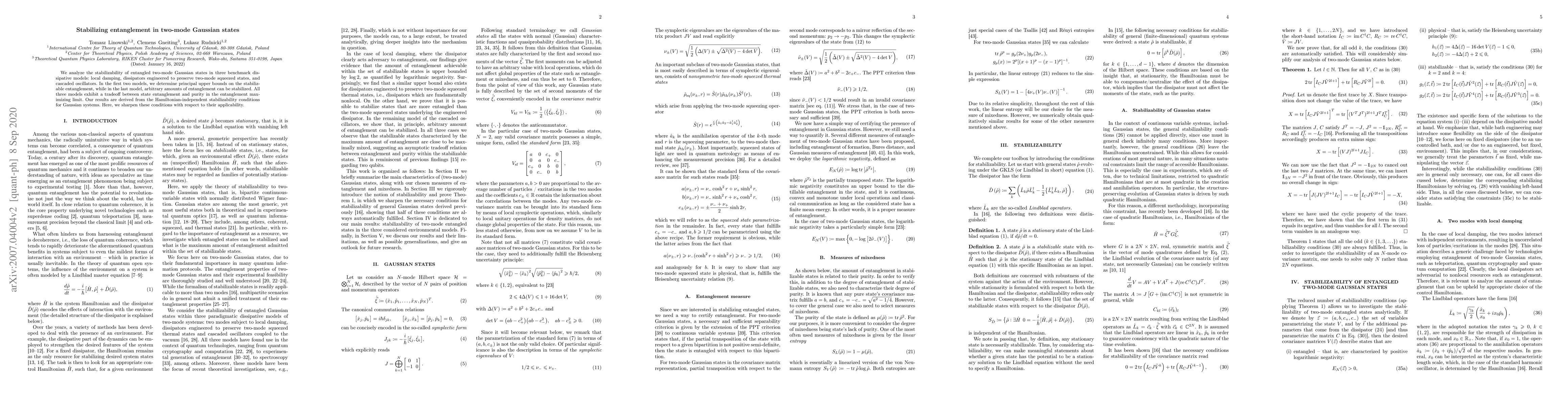 We analyze the stabilizability of entangled two-mode Gaussian states in three benchmark dissipative models: local damping, dissipators engineered to preserve two-mode squeezed states, and cascaded oscillators. In the first two models, we determine principal upper bounds on the stabilizable entanglement, while in the last model, arbitrary amounts of entanglement can be stabilized. All three models exhibit a tradeoff between state entanglement and purity in the entanglement maximizing limit. Our results are derived from the Hamiltonian-independent stabilizability conditions for Gaussian systems. Here, we sharpen these conditions with respect to their applicability.