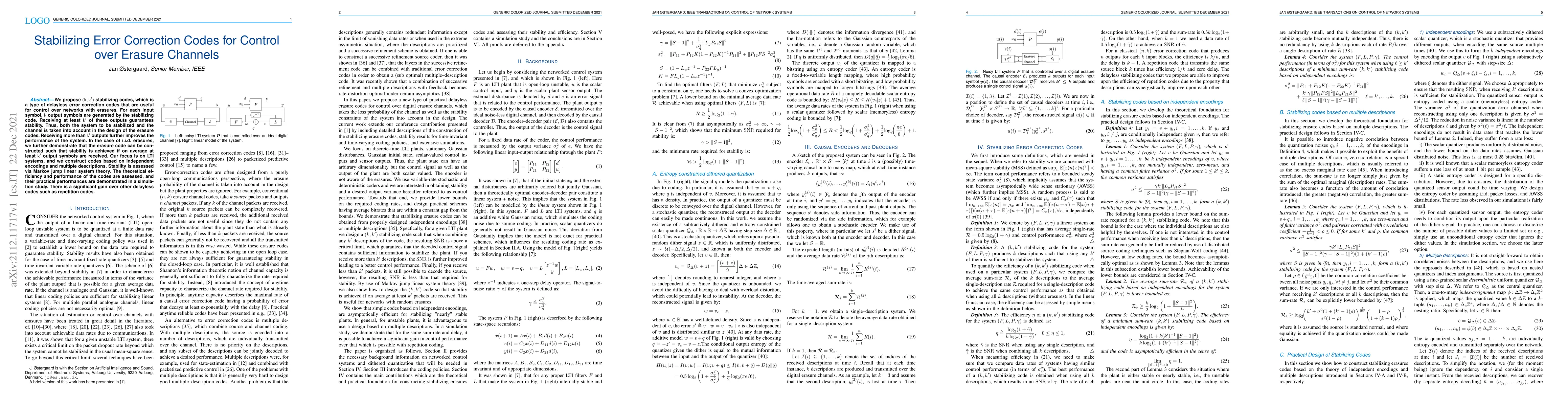 This paper proposes $(k,k')$ stabilizing codes for error correction over erasure channels, ensuring stability by generating $k$ output symbols per input and requiring at least $k'$ outputs for stability. The codes are shown to significantly outperform traditional repetition codes in simulations.