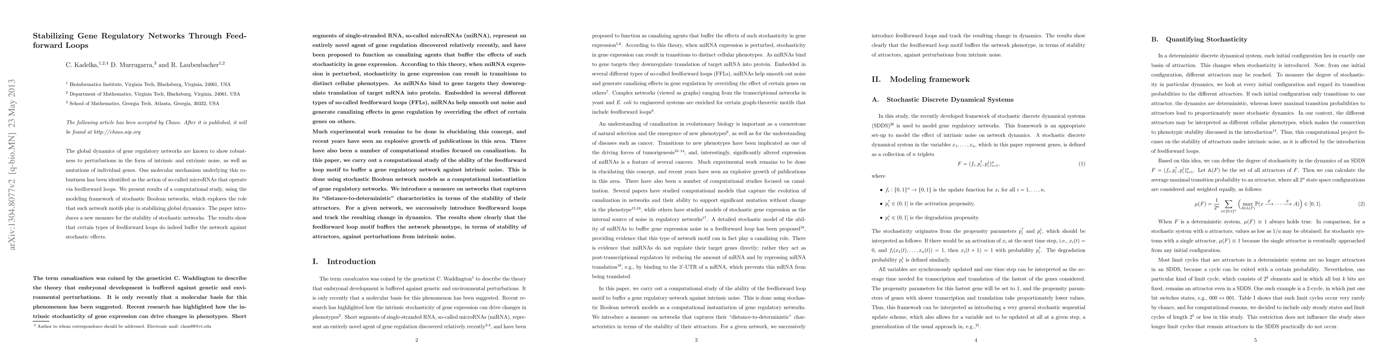 The global dynamics of gene regulatory networks are known to show robustness to perturbations in the form of intrinsic and extrinsic noise, as well as mutations of individual genes. One molecular mechanism underlying this robustness has been identified as the action of so-called microRNAs that operate via feedforward loops. We present results of a computational study, using the modeling framework of stochastic Boolean networks, which explores the role that such network motifs play in stabilizing global dynamics. The paper introduces a new measure for the stability of stochastic networks. The results show that certain types of feedforward loops do indeed buffer the network against stochastic effects.
