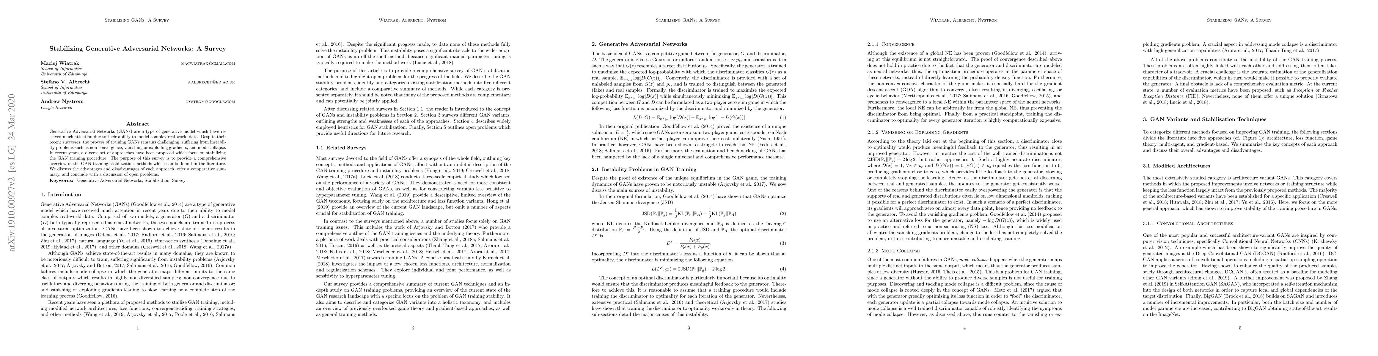 This paper surveys various methods aimed at stabilizing the training of Generative Adversarial Networks (GANs), addressing issues like non-convergence and mode collapse. It provides a comparative analysis of these approaches, highlighting their advantages and disadvantages, and discusses remaining challenges in GAN training.
