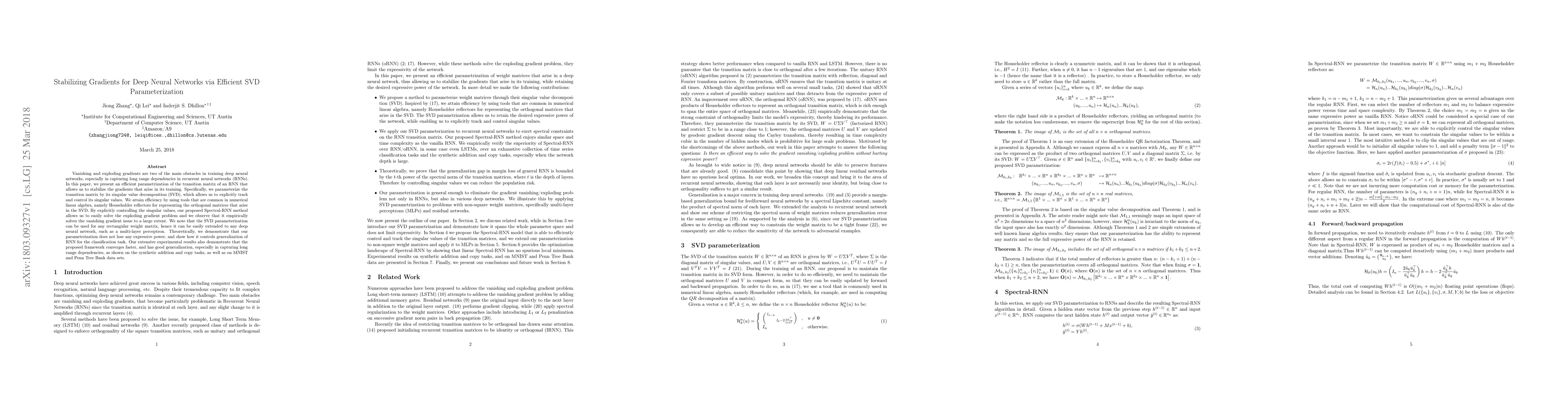 This paper proposes an efficient SVD parameterization for the transition matrix of RNNs to stabilize gradients during training, using Householder reflectors for computational efficiency. The Spectral-RNN method effectively addresses both exploding and vanishing gradient problems, leading to faster convergence and better generalization, especially in capturing long-range dependencies.