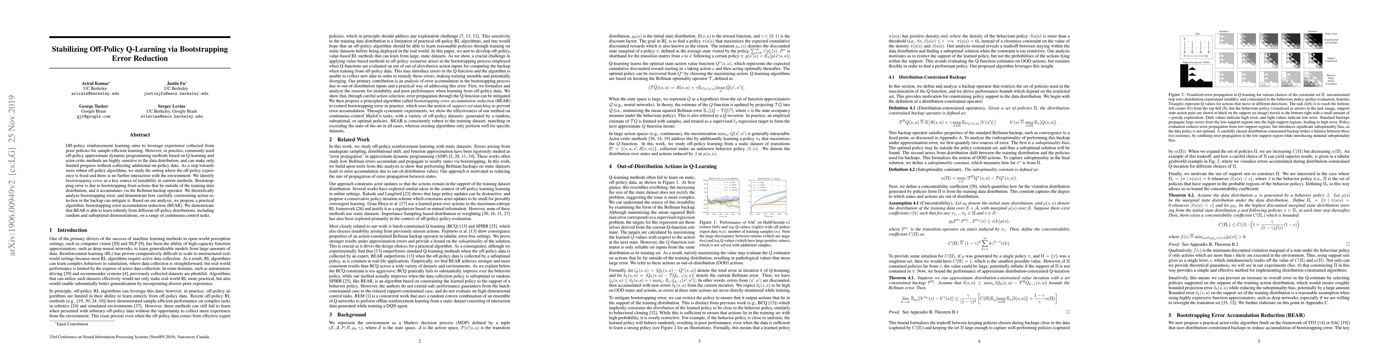 This paper proposes BEAR, an algorithm to stabilize off-policy Q-learning by reducing bootstrapping error, which arises from actions outside the training data distribution. The authors demonstrate that constraining action selection in the backup process mitigates this error, leading to robust learning across various off-policy distributions in continuous control tasks.