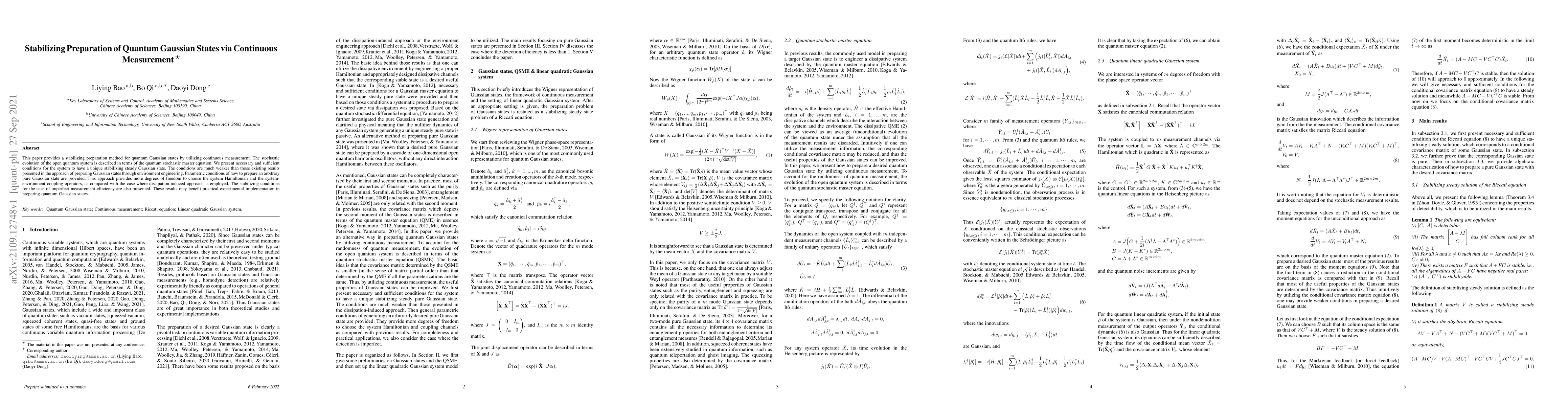 This paper introduces a method for preparing quantum Gaussian states using continuous measurement, providing necessary and sufficient conditions for a unique steady Gaussian state. The approach offers more flexibility compared to traditional methods, benefiting practical quantum state preparation.