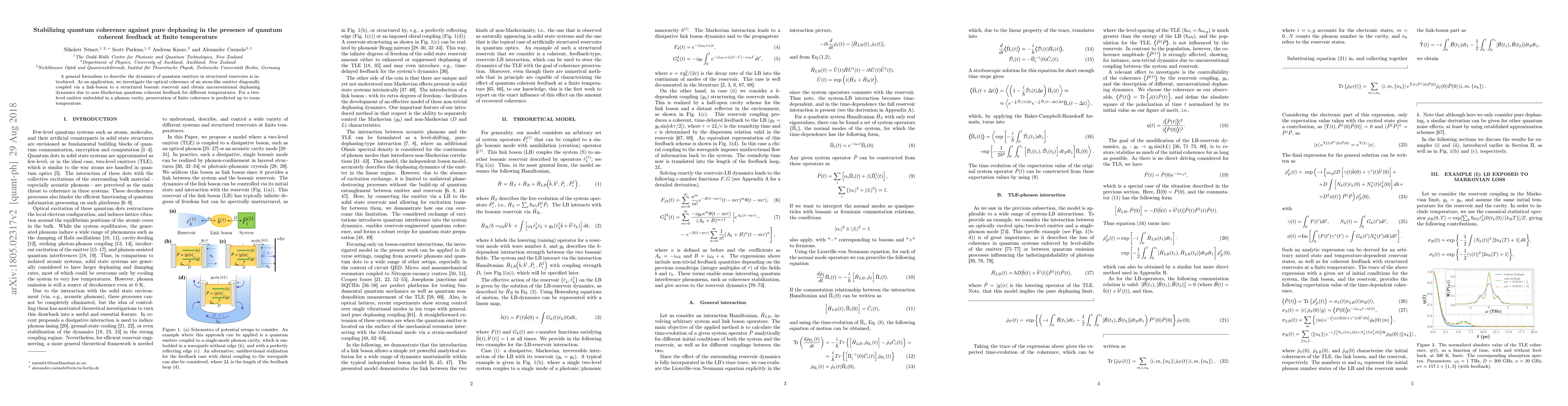 This paper introduces a formalism to study quantum emitter dynamics in structured reservoirs, demonstrating that quantum feedback can stabilize coherence against pure dephasing. It predicts that a two-level emitter in a phonon cavity can maintain coherence up to room temperature due to non-Markovian effects.