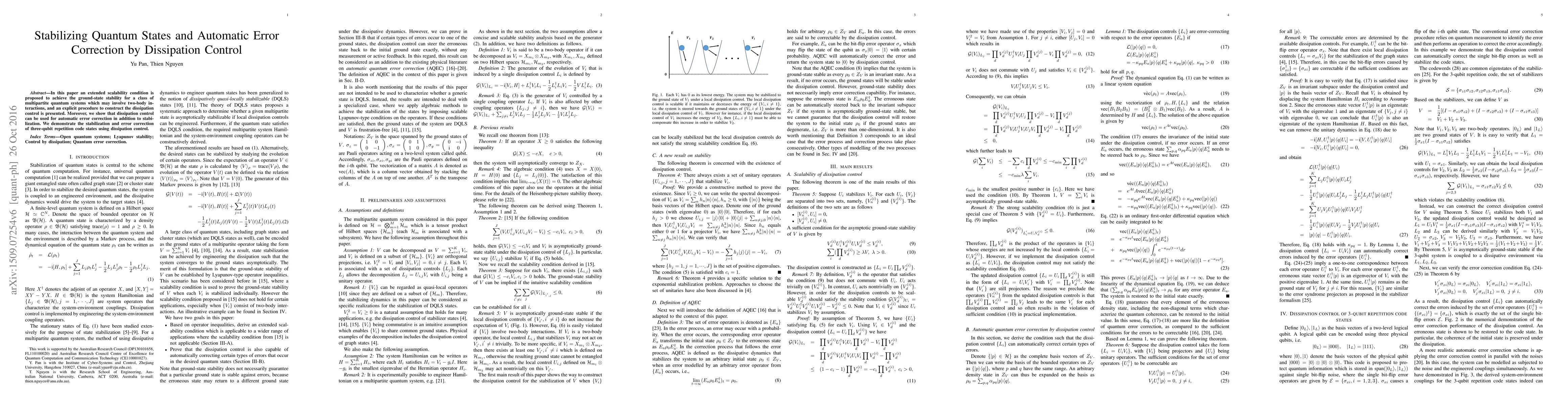 This paper proposes an extended scalability condition for stabilizing ground-state multipartite quantum systems and introduces a dissipation control method for automatic error correction. It demonstrates the practical application of the method through stabilization and error correction of three-qubit repetition code states.