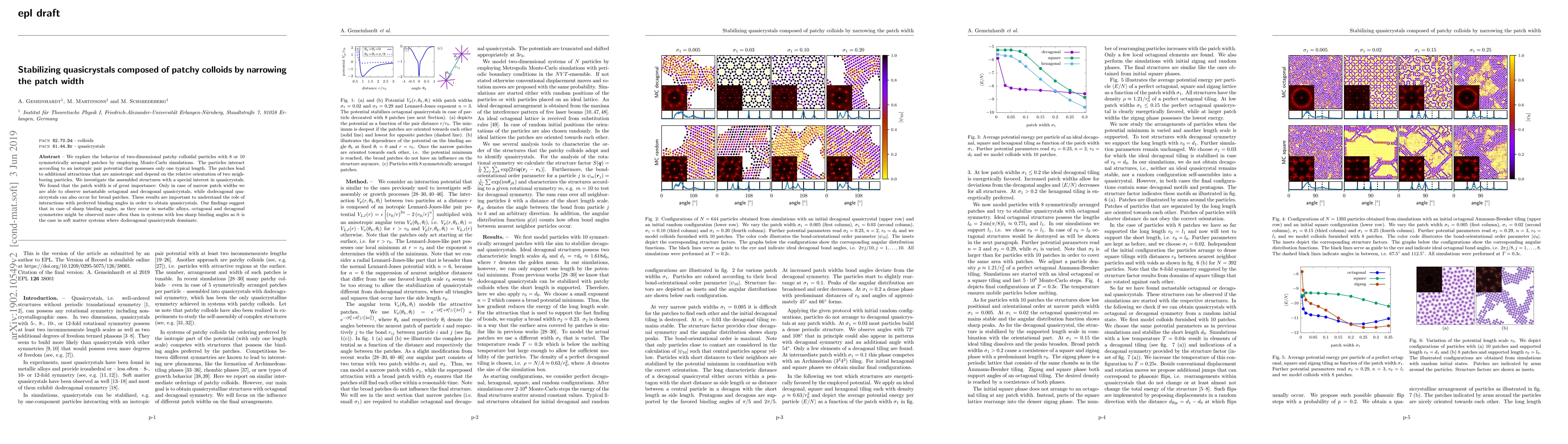 This study uses Monte-Carlo simulations to investigate two-dimensional patchy colloidal particles, finding that narrow patch widths stabilize metastable octagonal and decagonal quasicrystals, while broader patches allow for dodecagonal quasicrystals. The results highlight the importance of anisotropic interactions and preferred binding angles in forming quasicrystals.