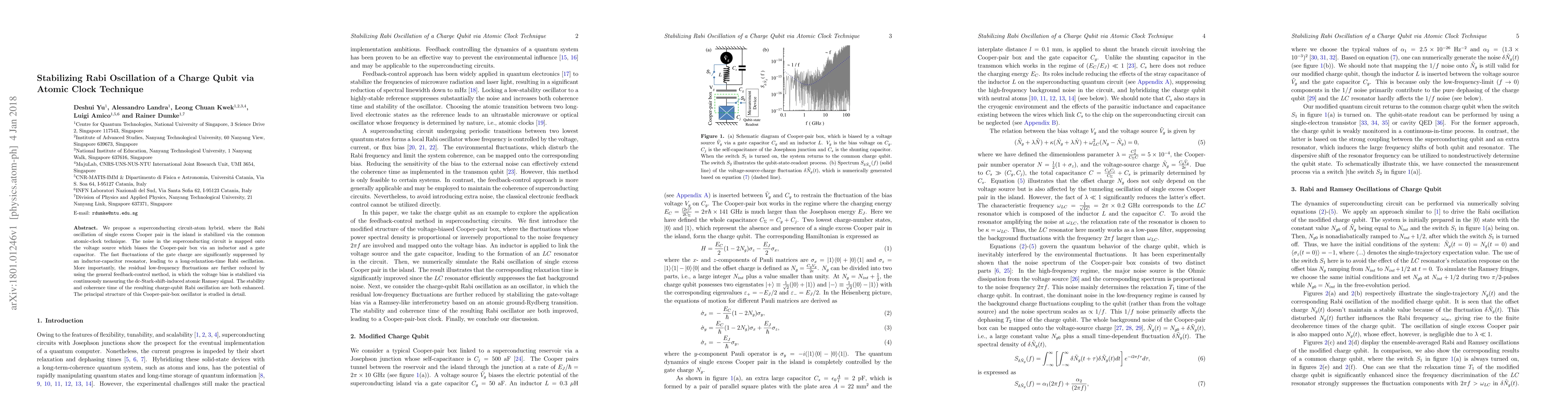 The paper introduces a novel hybrid superconducting circuit-atom system for stabilizing Rabi oscillation of a charge qubit using atomic clock techniques, combining LC resonator filtering and feedback control to suppress noise.
