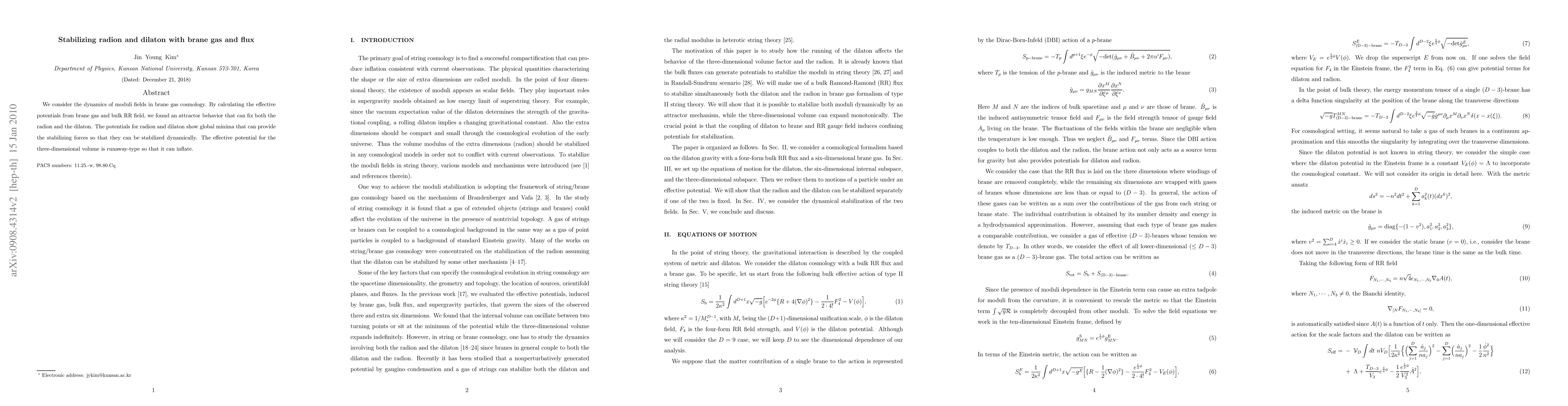 This paper investigates the stabilization of moduli fields, specifically the radion and dilaton, in brane gas cosmology through effective potentials derived from brane gas and bulk RR fields, revealing an attractor behavior that dynamically stabilizes these fields and supports inflationary dynamics for the three-dimensional volume.