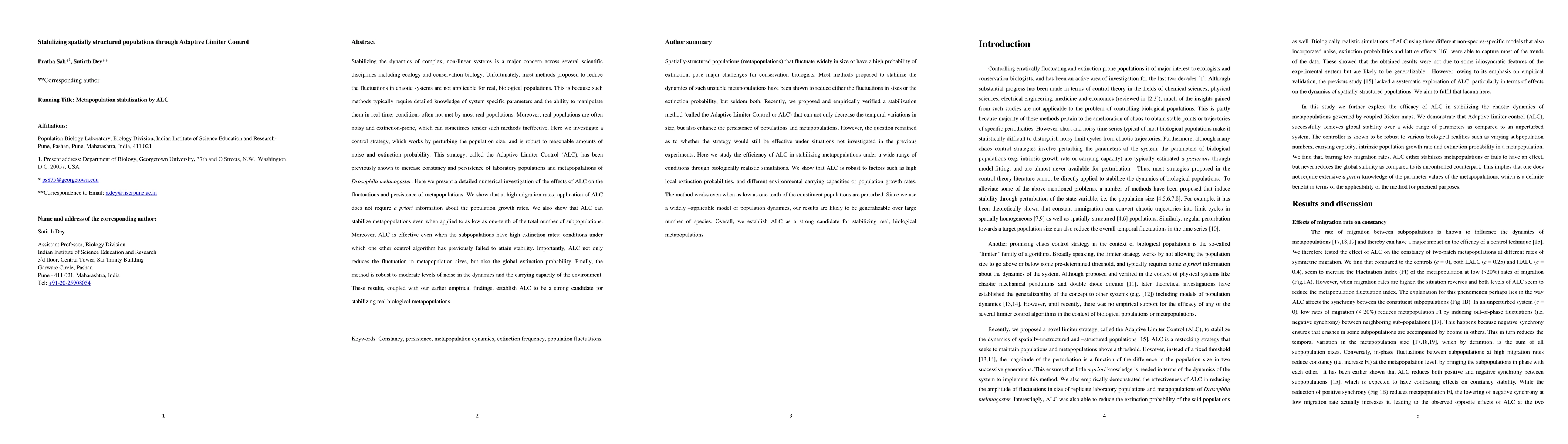 Stabilizing the dynamics of complex, non-linear systems is a major concern across several scientific disciplines including ecology and conservation biology. Unfortunately, most methods proposed to reduce the fluctuations in chaotic systems are not applicable for real, biological populations. This is because such methods typically require detailed knowledge of system specific parameters and the ability to manipulate them in real time; conditions often not met by most real populations. Moreover, real populations are often noisy and extinction-prone, which can sometimes render such methods ineffective. Here we investigate a control strategy, which works by perturbing the population size, and is robust to reasonable amounts of noise and extinction probability. This strategy, called the Adaptive Limiter Control (ALC), has been previously shown to increase constancy and persistence of laboratory populations and metapopulations of Drosophila melanogaster. Here we present a detailed numerical investigation of the effects of ALC on the fluctuations and persistence of metapopulations. We show that at high migration rates, application of ALC does not require a priori information about the population growth rates. We also show that ALC can stabilize metapopulations even when applied to as low as one-tenth of the total number of subpopulations. Moreover, ALC is effective even when the subpopulations have high extinction rates: conditions under which one other control algorithm has previously failed to attain stability. Importantly, ALC not only reduces the fluctuation in metapopulation sizes, but also the global extinction probability. Finally, the method is robust to moderate levels of noise in the dynamics and the carrying capacity of the environment. These results, coupled with our earlier empirical findings, establish ALC to be a strong candidate for stabilizing real biological metapopulations.