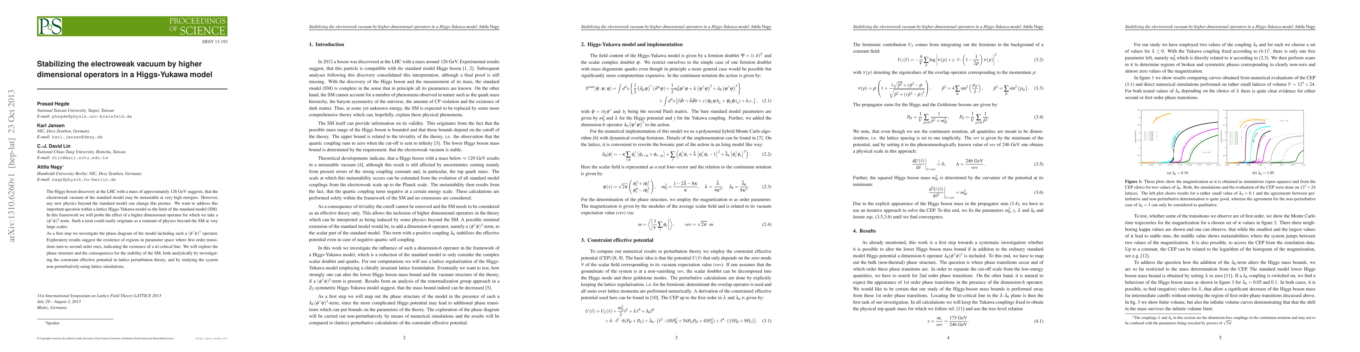 The Higgs boson discovery at the LHC with a mass of approximately 126 GeV suggests, that the electroweak vacuum of the standard model may be metastable at very high energies. However, any new physics beyond the standard model can change this picture. We want to address this important question within a lattice Higgs-Yukawa model as the limit of the standard model (SM). In this framework we will probe the effect of a higher dimensional operator for which we take a $(\phi^{\dagger}\phi)^3$-term. Such a term could easily originate as a remnant of physics beyond the SM at very large scales. As a first step we investigate the phase diagram of the model including such a $(\phi^{\dagger}\phi)^3$ operator. Exploratory results suggest the existence of regions in parameter space where first order transitions turn to second order ones, indicating the existence of a tri-critical line. We will explore the phase structure and the consequences for the stability of the SM, both analytically by investigating the constraint effective potential in lattice perturbation theory, and by studying the system non-perturbatively using lattice simulations.