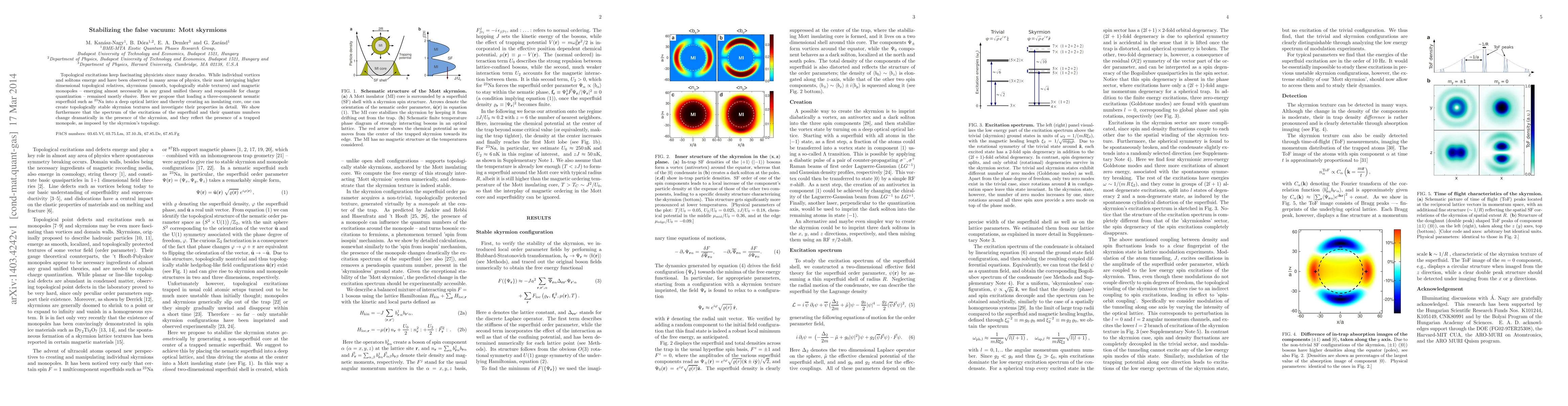 Topological excitations keep fascinating physicists since many decades. While individual vortices and solitons emerge and have been observed in many areas of physics, their most intriguing higher dimensional topological relatives, skyrmions (smooth, topologically stable textures) and magnetic monopoles -- emerging almost necessarily in any grand unified theory and responsible for charge quantization -- remained mostly elusive. Here we propose that loading a three-component nematic superfluid such as $^{23}$Na into a deep optical lattice and thereby creating an insulating core, one can create topologically stable skyrmion textures and investigate their properties in detail. We show furthermore that the spectrum of the excitations of the superfluid and their quantum numbers change dramatically in the presence of the skyrmion, and they reflect the presence of a trapped monopole, as imposed by the skyrmion's topology.