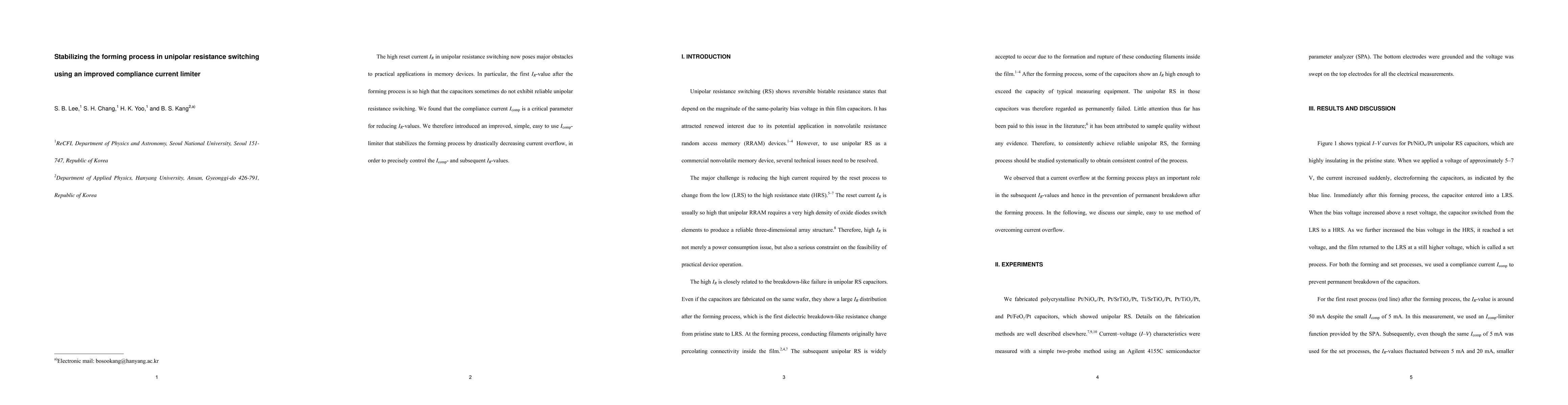 This paper proposes an improved compliance current limiter to stabilize the forming process in unipolar resistance switching, addressing the high reset current issue that hinders practical memory device applications. The new limiter effectively reduces current overflow and precisely controls the compliance current, thereby enhancing the reliability of the unipolar resistance switching.