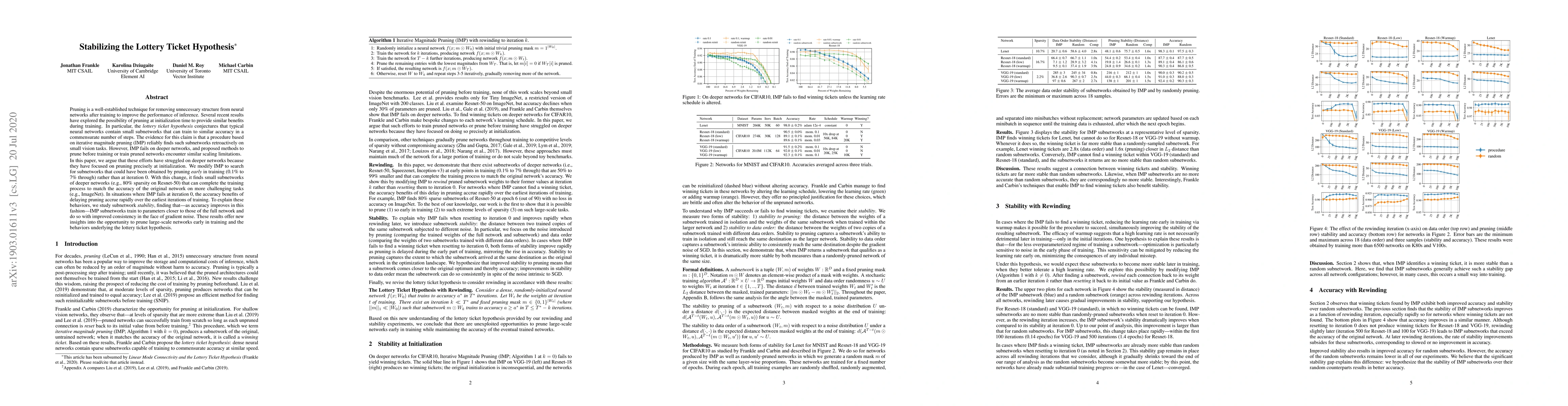 Pruning is a well-established technique for removing unnecessary structure from neural networks after training to improve the performance of inference. Several recent results have explored the possibility of pruning at initialization time to provide similar benefits during training. In particular, the "lottery ticket hypothesis" conjectures that typical neural networks contain small subnetworks that can train to similar accuracy in a commensurate number of steps. The evidence for this claim is that a procedure based on iterative magnitude pruning (IMP) reliably finds such subnetworks retroactively on small vision tasks. However, IMP fails on deeper networks, and proposed methods to prune before training or train pruned networks encounter similar scaling limitations. In this paper, we argue that these efforts have struggled on deeper networks because they have focused on pruning precisely at initialization. We modify IMP to search for subnetworks that could have been obtained by pruning early in training (0.1% to 7% through) rather than at iteration 0. With this change, it finds small subnetworks of deeper networks (e.g., 80% sparsity on Resnet-50) that can complete the training process to match the accuracy of the original network on more challenging tasks (e.g., ImageNet). In situations where IMP fails at iteration 0, the accuracy benefits of delaying pruning accrue rapidly over the earliest iterations of training. To explain these behaviors, we study subnetwork "stability," finding that - as accuracy improves in this fashion - IMP subnetworks train to parameters closer to those of the full network and do so with improved consistency in the face of gradient noise. These results offer new insights into the opportunity to prune large-scale networks early in training and the behaviors underlying the lottery ticket hypothesis