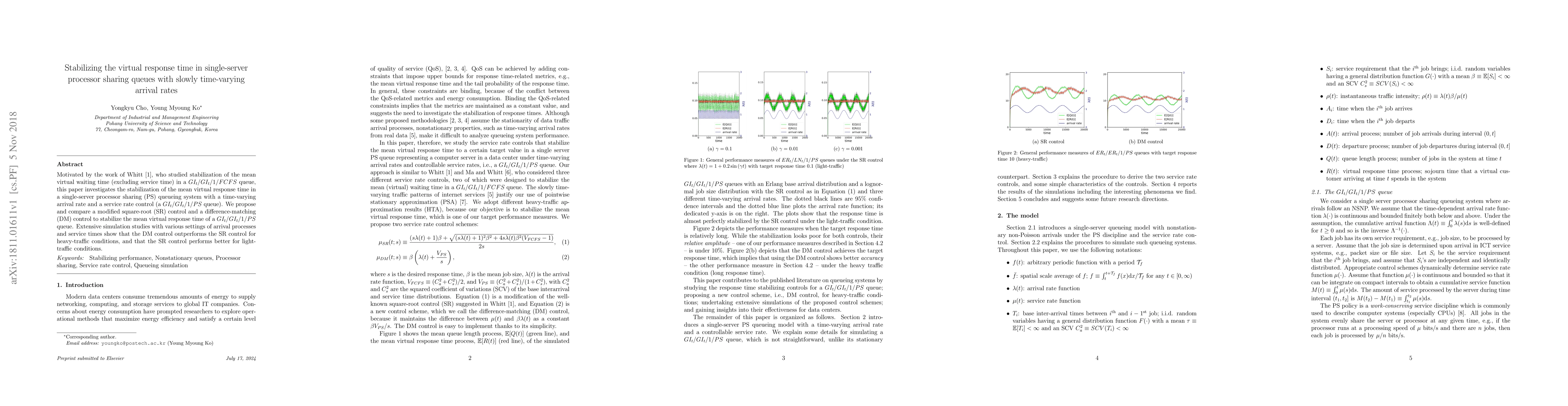Researchers compared two controls for stabilizing virtual response time in a single-server processor sharing queue with varying arrival rates, finding that one control performs better in heavy-traffic conditions and the other in light-traffic conditions.