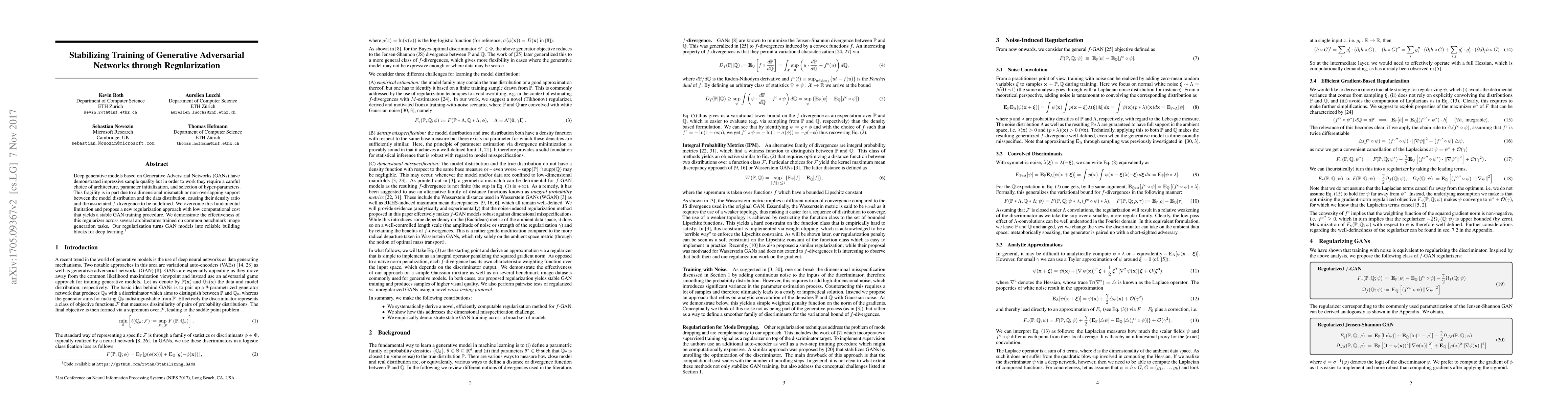 Deep generative models based on Generative Adversarial Networks (GANs) have demonstrated impressive sample quality but in order to work they require a careful choice of architecture, parameter initialization, and selection of hyper-parameters. This fragility is in part due to a dimensional mismatch or non-overlapping support between the model distribution and the data distribution, causing their density ratio and the associated f-divergence to be undefined. We overcome this fundamental limitation and propose a new regularization approach with low computational cost that yields a stable GAN training procedure. We demonstrate the effectiveness of this regularizer across several architectures trained on common benchmark image generation tasks. Our regularization turns GAN models into reliable building blocks for deep learning.