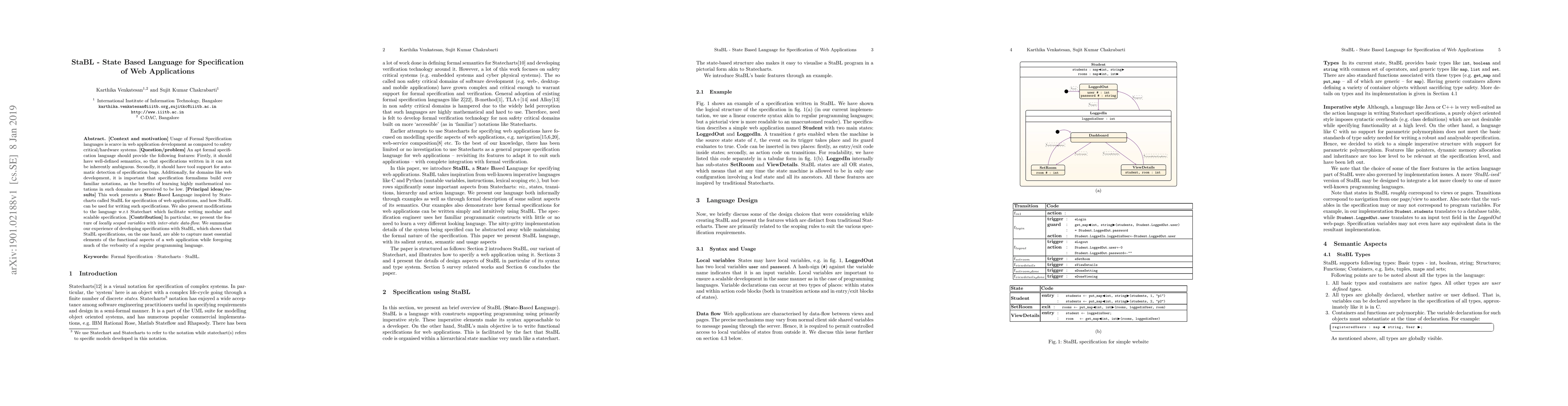 This paper introduces StaBL, a State Based Language inspired by Statecharts, for specifying web applications, emphasizing well-defined semantics and tool support for bug detection. The authors highlight StaBL's ability to capture functional aspects of web applications with reduced verbosity, leveraging familiar notations.