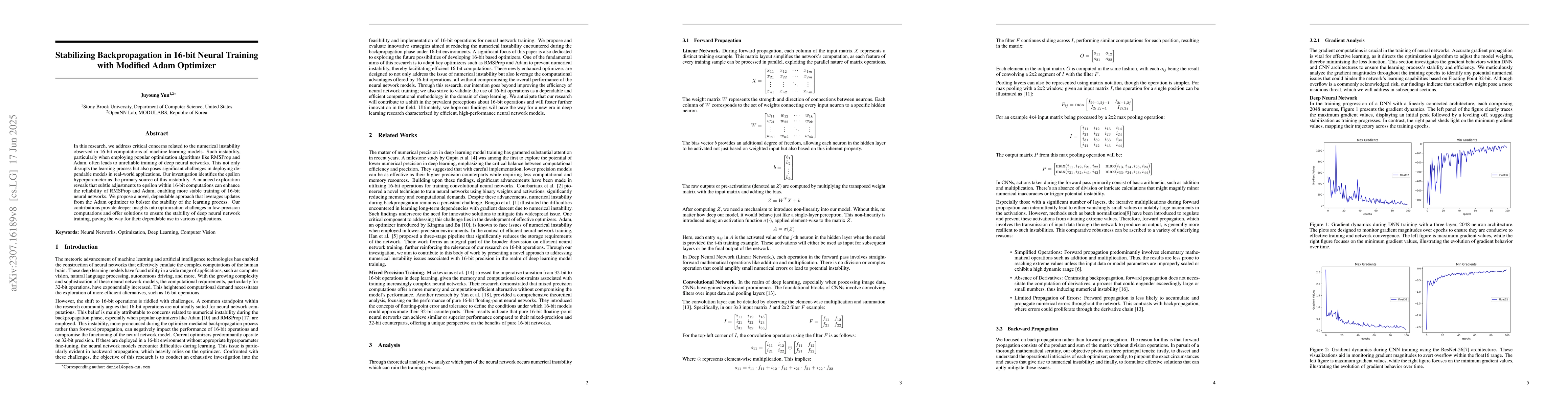 This paper tackles the numerical instability in 16-bit neural network training caused by the Adam optimizer, identifying the epsilon hyperparameter as the main culprit. The authors propose a refined approach that adjusts epsilon to enhance stability, ensuring dependable training and paving the way for reliable deployment of low-precision deep learning models.