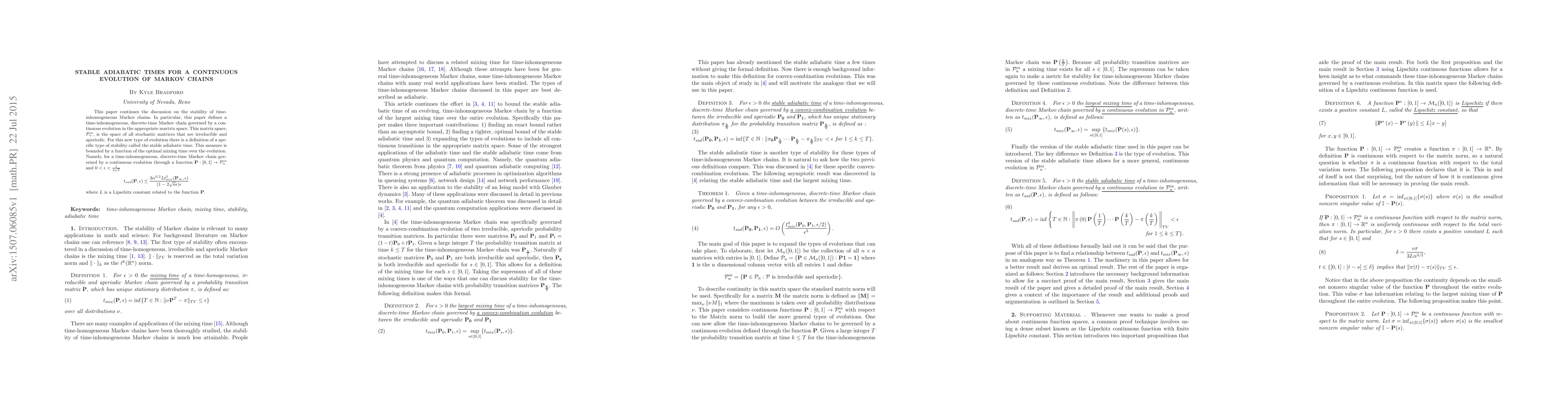 This paper introduces stable adiabatic times for time-inhomogeneous Markov chains evolving continuously through a matrix space of irreducible and aperiodic stochastic matrices. It establishes a bound for this stability measure in terms of the optimal mixing time and a Lipschitz constant.