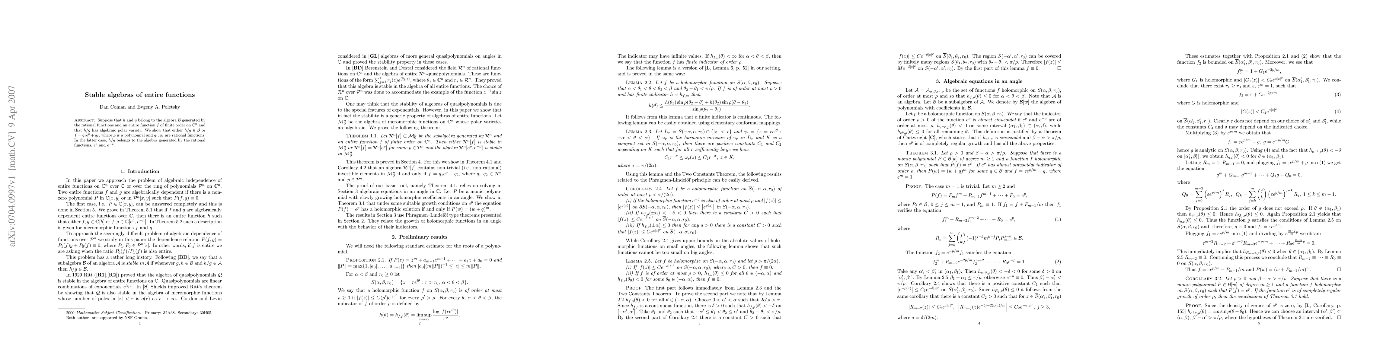 Suppose that $h$ and $g$ belong to the algebra $\B$ generated by the rational functions and an entire function $f$ of finite order on ${\Bbb C}^n$ and that $h/g$ has algebraic polar variety. We show that either $h/g\in\B$ or $f=q_1e^p+q_2$, where $p$ is a polynomial and $q_1,q_2$ are rational functions. In the latter case, $h/g$ belongs to the algebra generated by the rational functions, $e^p$ and $e^{-p}$.