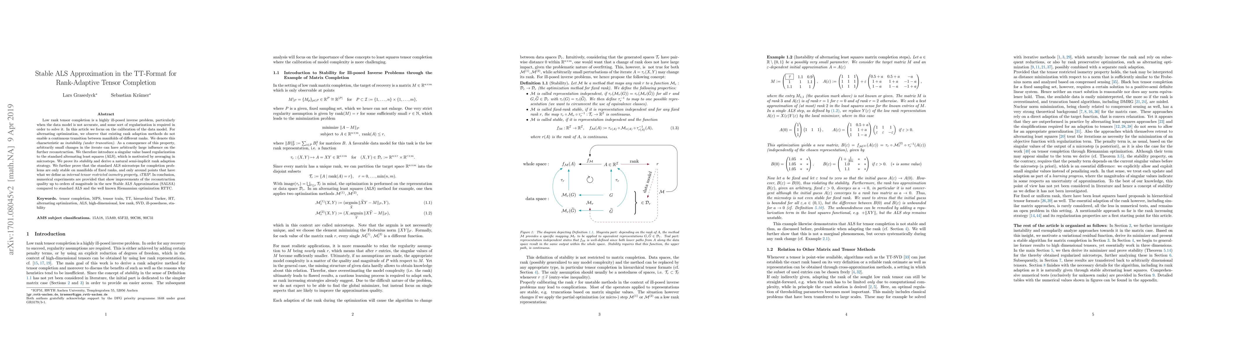Low rank tensor completion is a highly ill-posed inverse problem, particularly when the data model is not accurate, and some sort of regularization is required in order to solve it. In this article we focus on the calibration of the data model. For alternating optimization, we observe that existing rank adaption methods do not enable a continuous transition between manifolds of different ranks. We denote this characteristic as $\textit{instability (under truncation)}$. As a consequence of this property, arbitrarily small changes in the iterate can have arbitrarily large influence on the further reconstruction. We therefore introduce a singular value based regularization to the standard alternating least squares (ALS), which is motivated by averaging in microsteps. We prove its $\textit{stability}$ and derive a natural semi-implicit rank adaption strategy. We further prove that the standard ALS microsteps for completion problems are only stable on manifolds of fixed ranks, and only around points that have what we define as $\textit{internal tensor restricted isometry property, iTRIP}$. In conclusion, numerical experiments are provided that show improvements of the reconstruction quality up to orders of magnitude in the new Stable ALS Approximation (SALSA) compared to standard ALS and the well known Riemannian optimization RTTC.
