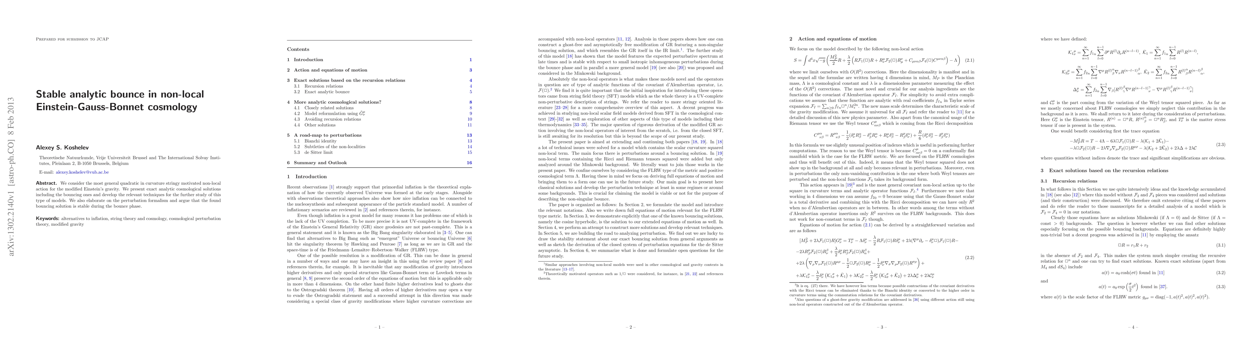 This paper explores a non-local Einstein-Gauss-Bonnet gravity model, presenting exact analytic cosmological solutions, including stable bouncing solutions. The authors develop techniques for studying these models and demonstrate the stability of the bouncing phase through perturbation analysis.