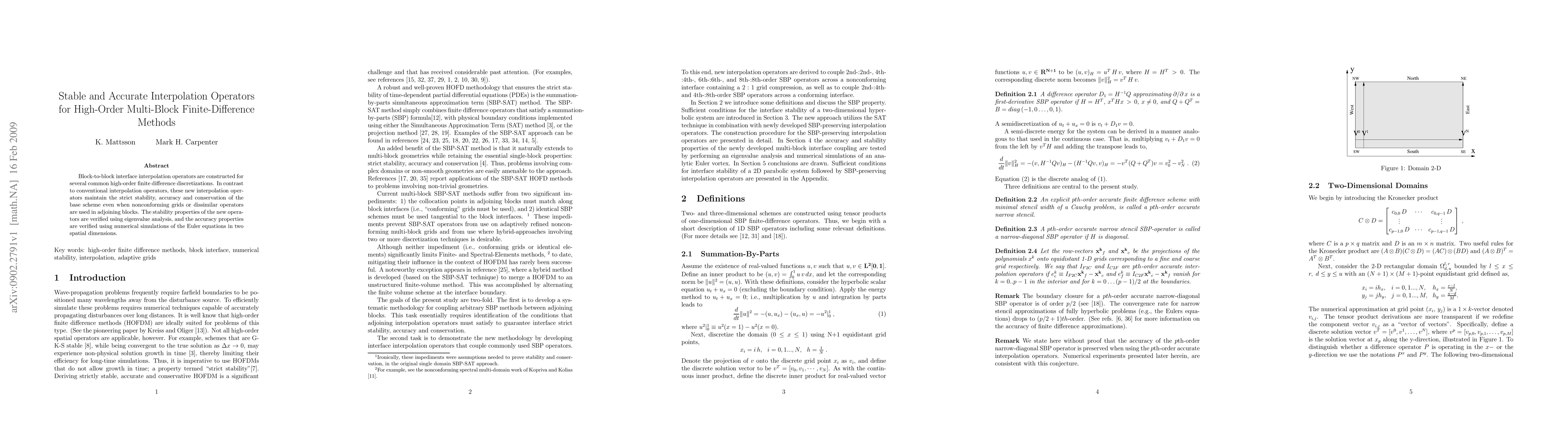 This paper develops new block-to-block interpolation operators for high-order finite-difference methods that preserve stability, accuracy, and conservation across nonconforming grids. Stability is verified via eigenvalue analysis, and accuracy is confirmed through Euler equations simulations in 2D.