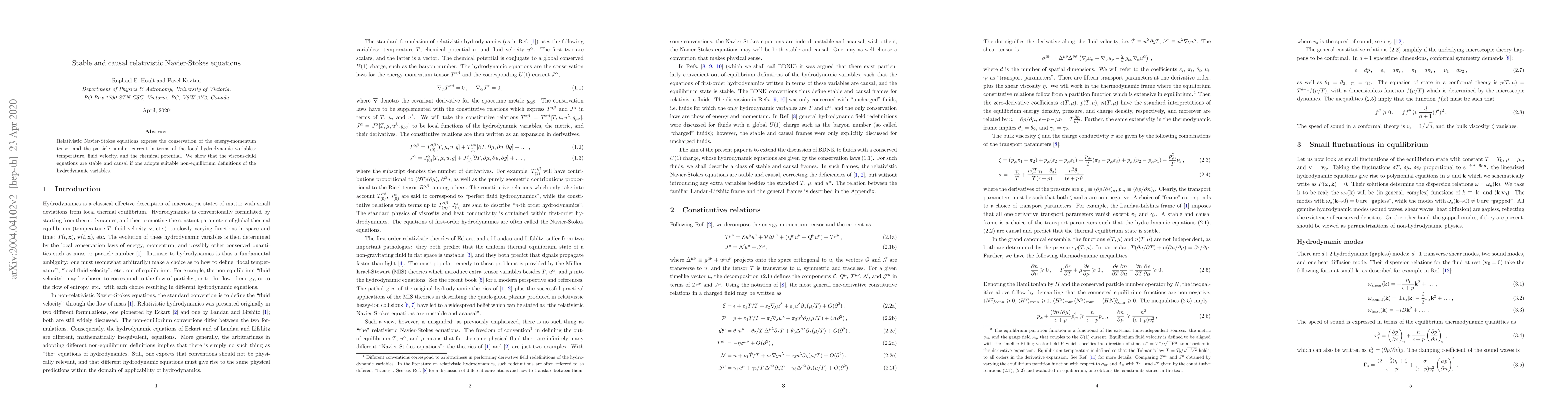The paper presents stable and causal relativistic Navier-Stokes equations for viscous fluids, ensuring conservation of energy-momentum and particle number through local hydrodynamic variables, with stability and causality achieved via suitable non-equilibrium definitions.