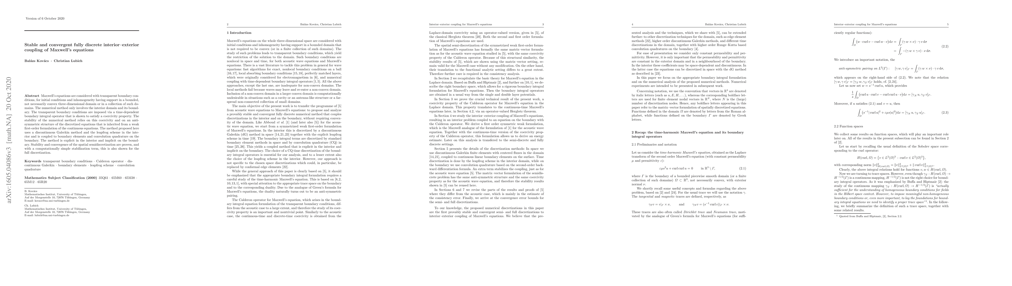 This paper presents a stable and convergent fully discrete numerical method for solving Maxwell's equations in bounded domains, employing a discontinuous Galerkin method and a leapfrog scheme. Transparent boundary conditions are achieved via a time-dependent boundary integral operator, ensuring stability and convergence through coercivity and an anti-symmetric structure.