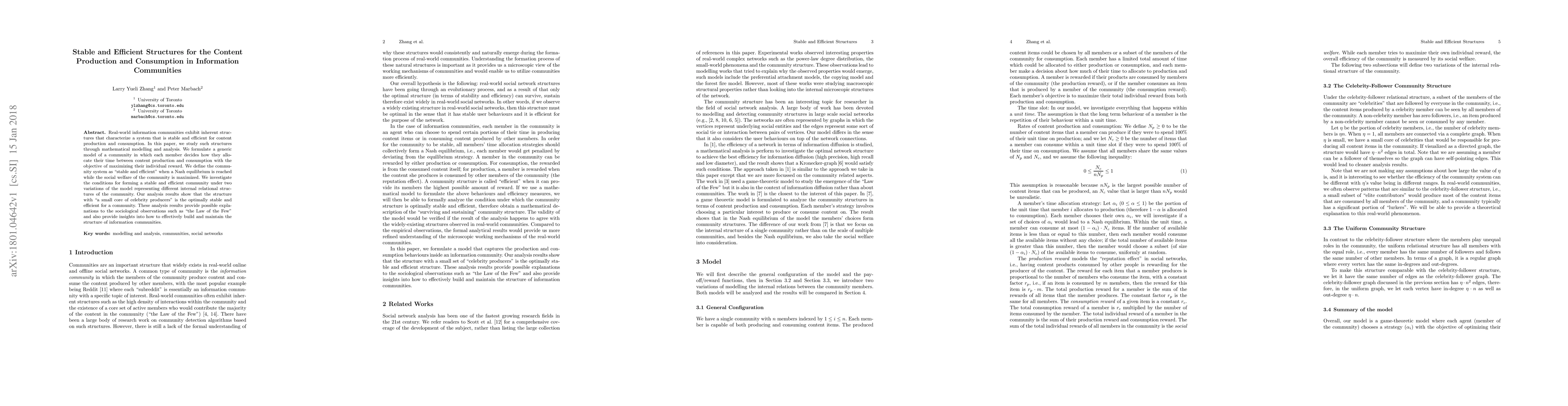 Real-world information communities exhibit inherent structures that characterize a system that is stable and efficient for content production and consumption. In this paper, we study such structures through mathematical modelling and analysis. We formulate a generic model of a community in which each member decides how they allocate their time between content production and consumption with the objective of maximizing their individual reward. We define the community system as "stable and efficient" when a Nash equilibrium is reached while the social welfare of the community is maximized. We investigate the conditions for forming a stable and efficient community under two variations of the model representing different internal relational structures of the community. Our analysis results show that the structure with "a small core of celebrity producers" is the optimally stable and efficient for a community. These analysis results provide possible explanations to the sociological observations such as "the Law of the Few" and also provide insights into how to effectively build and maintain the structure of information communities.