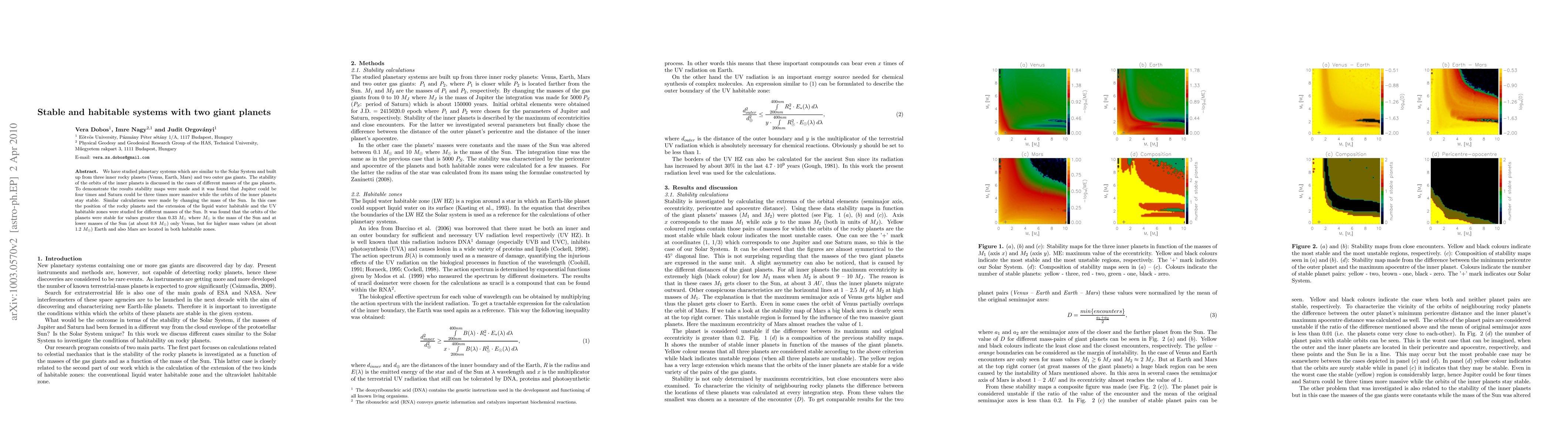 We have studied planetary systems which are similar to the Solar System and built up from three inner rocky planets (Venus, Earth, Mars) and two outer gas giants. The stability of the orbits of the inner planets is discussed in the cases of different masses of the gas planets. To demonstrate the results stability maps were made and it was found that Jupiter could be four times and Saturn could be three times more massive while the orbits of the inner planets stay stable. Similar calculations were made by changing the mass of the Sun. In this case the position of the rocky planets and the extension of the liquid water habitable and the UV habitable zones were studied for different masses of the Sun. It was found that the orbits of the planets were stable for values greater than 0.33 M_Sun where M_Sun is the mass of the Sun and at lower masses of the Sun (at about 0.8 M_Sun) only Venus, but for higher mass values (at about 1.2 M_Sun) Earth and also Mars are located in both habitable zones.