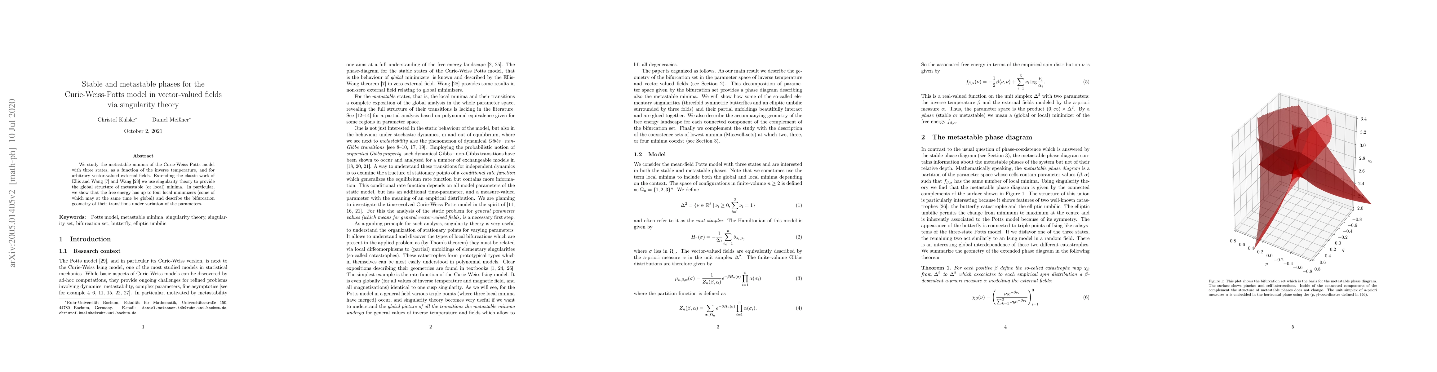 This paper explores the metastable minima of the Curie-Weiss Potts model with three states under vector-valued fields, employing singularity theory to reveal the global structure of these minima. It identifies up to four local minimizers and describes the bifurcation geometry of their transitions as parameters vary.