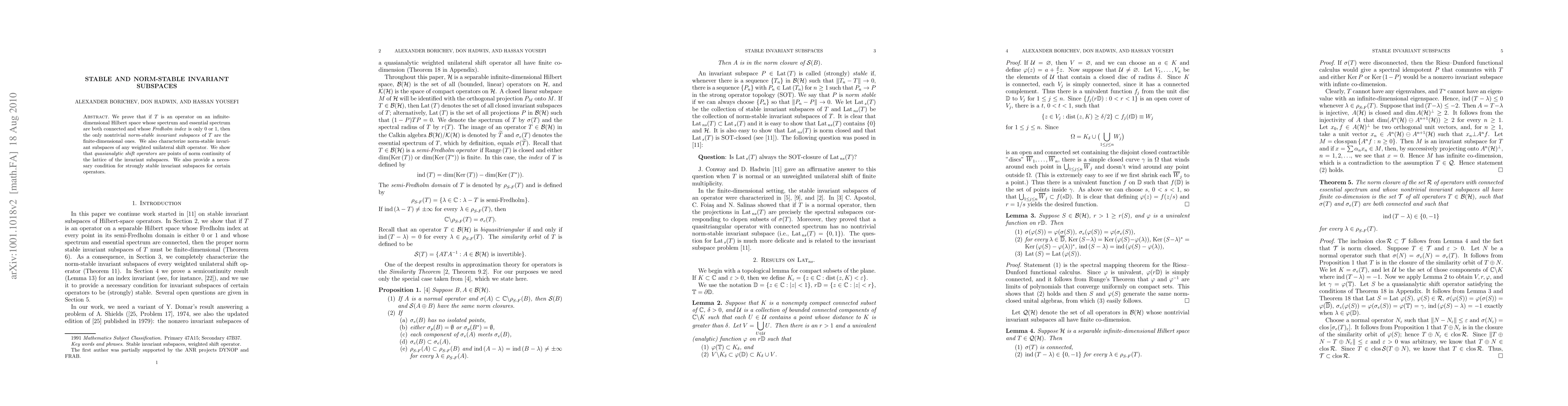 This paper proves that for operators T on infinite-dimensional Hilbert spaces with connected spectrum and essential spectrum, the only nontrivial norm-stable invariant subspaces are finite-dimensional. It also characterizes norm-stable subspaces for weighted unilateral shifts and provides conditions for strongly stable invariant subspaces.