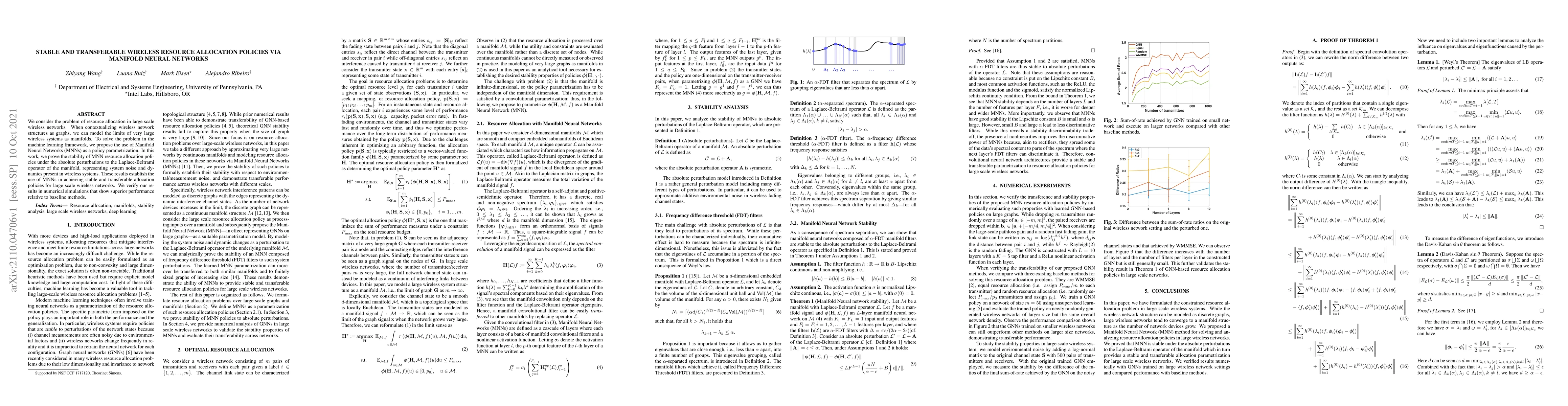This paper proposes using Manifold Neural Networks (MNNs) to develop stable and transferable resource allocation policies for large-scale wireless networks. The authors demonstrate the stability of MNN policies under perturbations, proving their effectiveness for dynamic wireless systems, and validate their approach through numerical simulations showing improved performance over baseline methods.