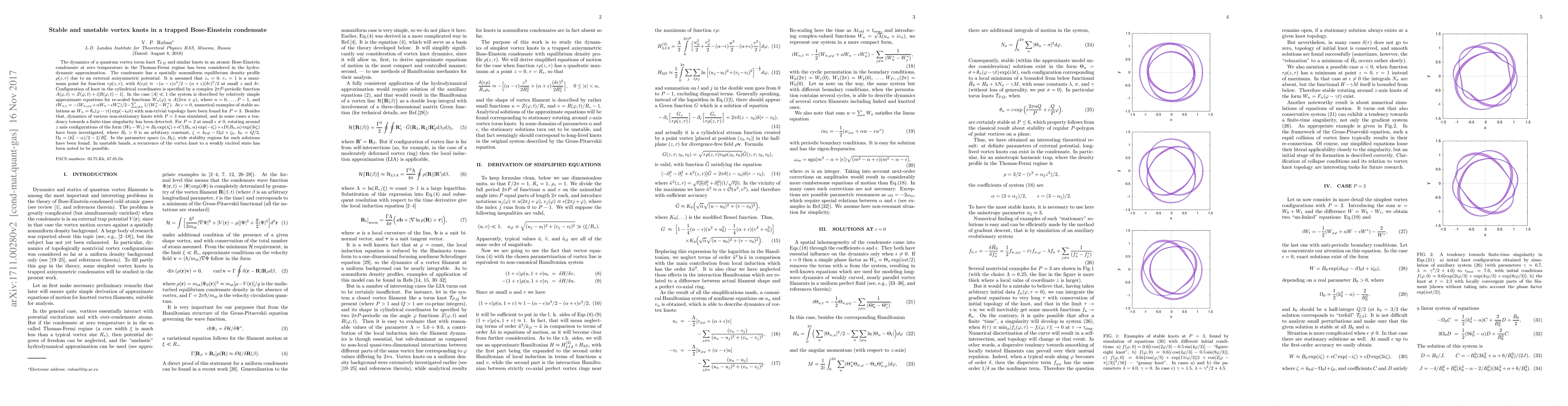 The dynamics of a quantum vortex torus knot ${\cal T}_{P,Q}$ and similar knots in an atomic Bose-Einstein condensate at zero temperature in the Thomas-Fermi regime has been considered in the hydrodynamic approximation. The condensate has a spatially nonuniform equilibrium density profile $\rho(z,r)$ due to an external axisymmetric potential. It is assumed that $z_*=0$, $r_*=1$ is a maximum point for function $r\rho(z,r)$, with $\delta (r\rho)\approx-(\alpha-\epsilon) z^2/2 -(\alpha+\epsilon) (\delta r)^2/2$ at small $z$ and $\delta r$. Configuration of knot in the cylindrical coordinates is specified by a complex $2\pi P$-periodic function $A(\varphi,t)=Z(\varphi,t)+i [R(\varphi,t)-1]$. In the case $|A|\ll 1$ the system is described by relatively simple approximate equations for re-scaled functions $W_n(\varphi)\propto A(2\pi n+\varphi)$, where $n=0,\dots,P-1$, and $iW_{n,t}=-(W_{n,\varphi\varphi}+\alpha W_n -\epsilon W_n^*)/2-\sum_{j\neq n}1/(W_n^*-W_j^*)$. At $\epsilon=0$, numerical examples of stable solutions as $W_n=\theta_n(\varphi-\gamma t)\exp(-i\omega t)$ with non-trivial topology have been found for $P=3$. Besides that, dynamics of various non-stationary knots with $P=3$ was simulated, and in some cases a tendency towards a finite-time singularity has been detected. For $P=2$ at small $\epsilon\neq 0$, rotating around $z$ axis configurations of the form $(W_0-W_1)\approx B_0\exp(i\zeta)+\epsilon C(B_0,\alpha)\exp(-i\zeta) + \epsilon D(B_0,\alpha)\exp(3i\zeta)$ have been investigated, where $B_0>0$ is an arbitrary constant, $\zeta=k_0\varphi -\Omega_0 t+\zeta_0$, $k_0=Q/2$, $\Omega_0=(k_0^2-\alpha)/2-2/B_0^2$. In the parameter space $(\alpha, B_0)$, wide stability regions for such solutions have been found. In unstable bands, a recurrence of the vortex knot to a weakly excited state has been noted to be possible.