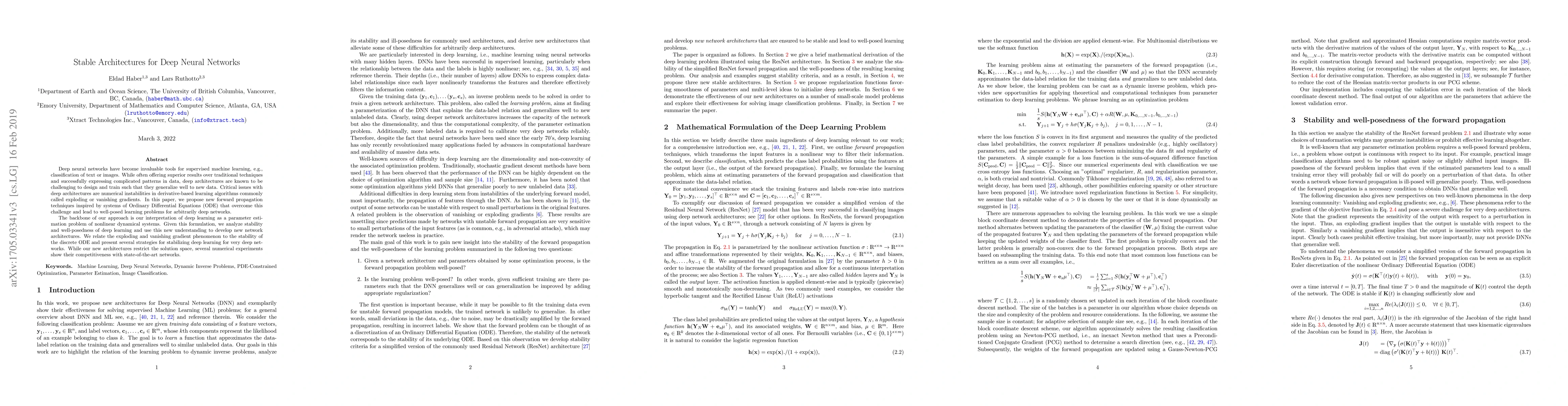 This paper proposes novel forward propagation techniques inspired by Ordinary Differential Equations to stabilize deep neural networks, addressing the issues of exploding and vanishing gradients. It interprets deep learning as parameter estimation for nonlinear dynamical systems, developing new architectures that maintain competitiveness with state-of-the-art methods.
