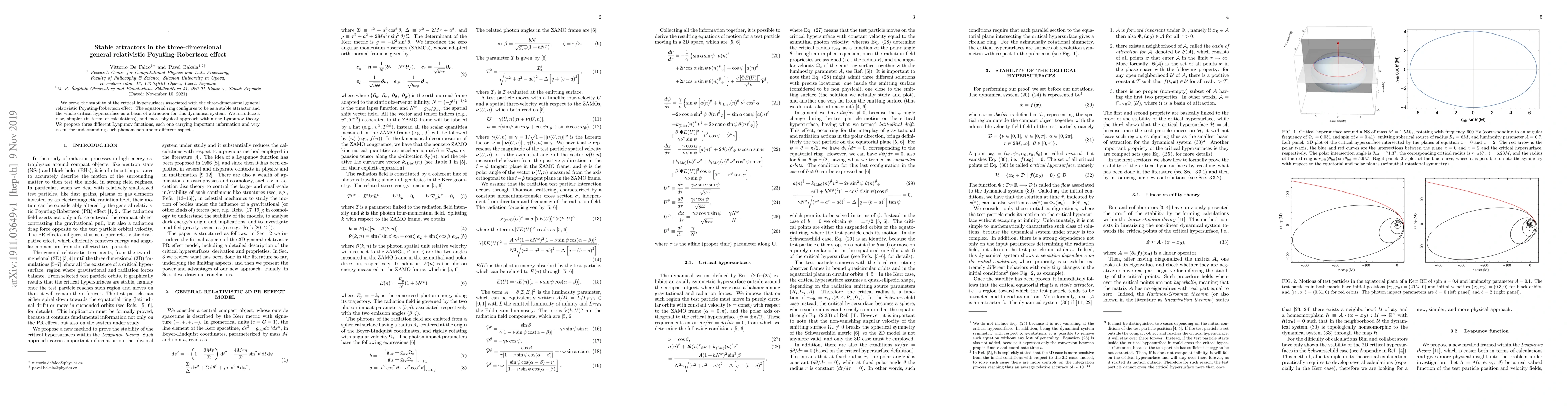 This paper proves the stability of critical hypersurfaces in the three-dimensional general relativistic Poynting-Robertson effect, showing that the equatorial ring acts as a stable attractor. The authors introduce a new, simpler approach using three distinct Lyapunov functions to better understand the dynamical system.