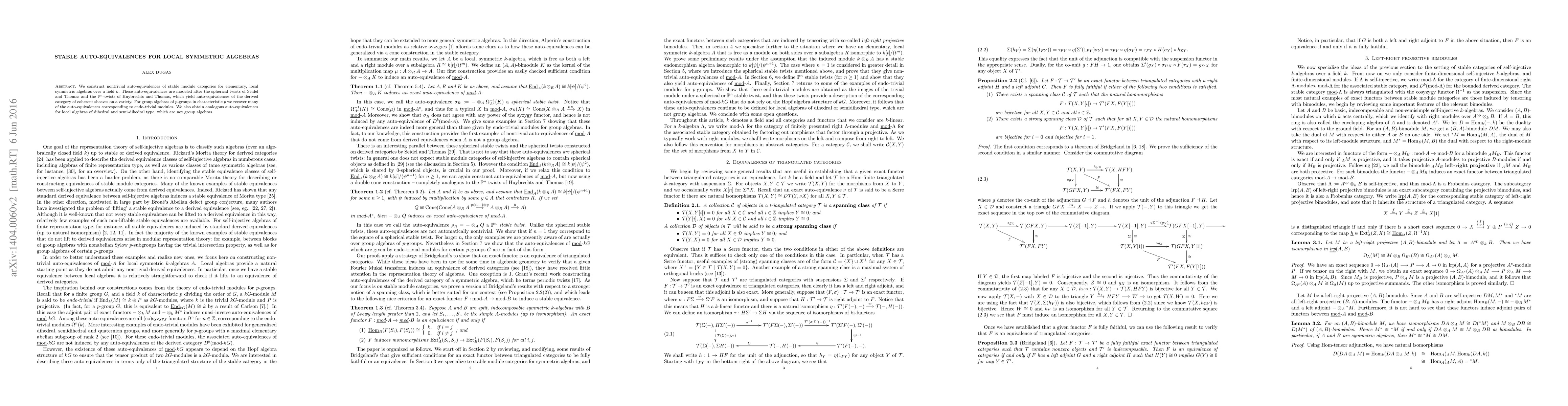 This paper constructs nontrivial auto-equivalences for stable module categories of local symmetric algebras, modeled after twists in derived categories of coherent sheaves. The authors recover many endo-trivial module auto-equivalences for p-group algebras and extend the results to dihedral and semi-dihedral local algebras.