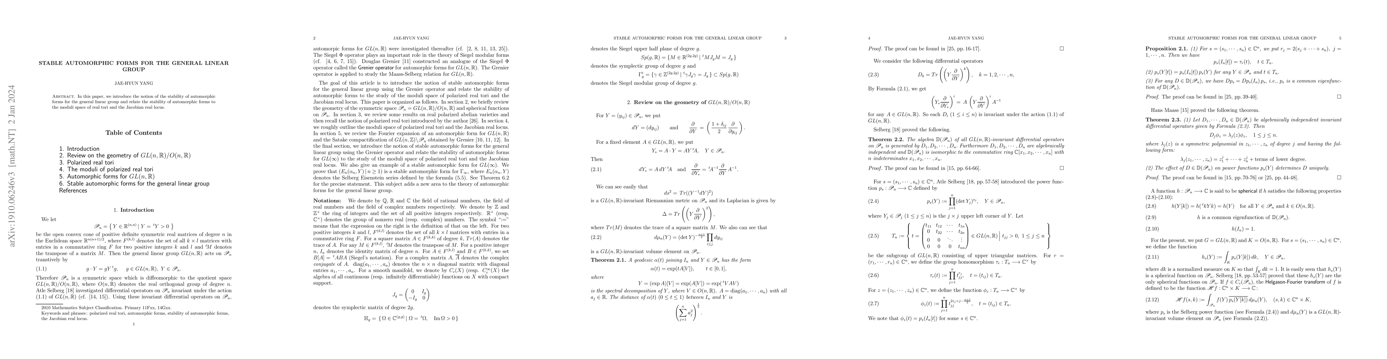 Summary: This paper defines the stability of automorphic forms for the general linear group and connects this stability to the moduli space of real tori and the Jacobian real locus, providing insights into their geometric and arithmetic properties.