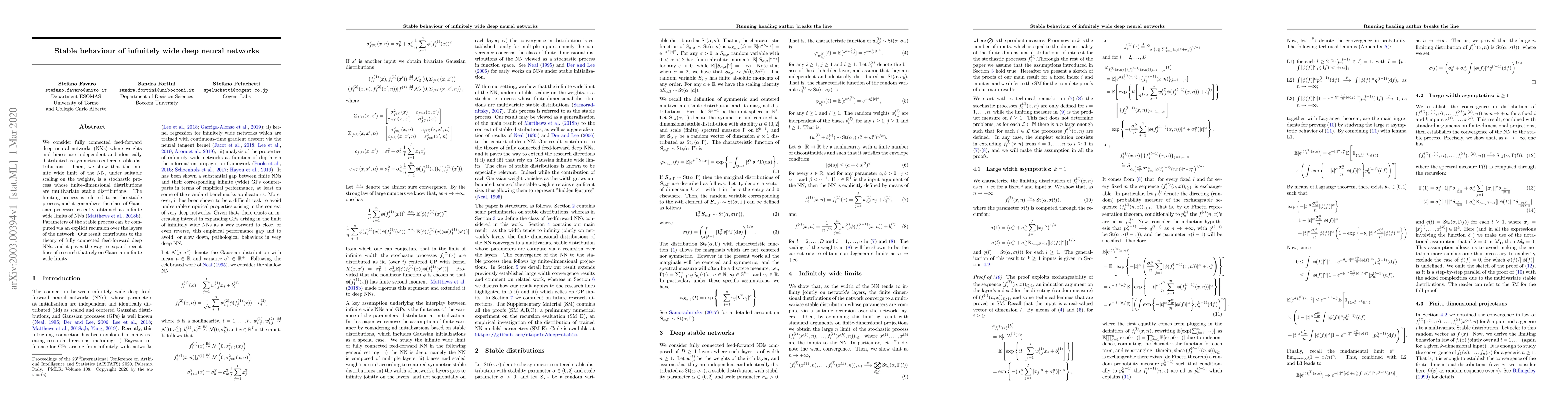 This paper investigates the behavior of infinitely wide deep neural networks (NNs) with weights and biases drawn from symmetric stable distributions, showing that their infinite width limit forms a stochastic process known as the stable process, which generalizes Gaussian processes. Parameters of this stable process can be computed through a recursive layer-wise method.