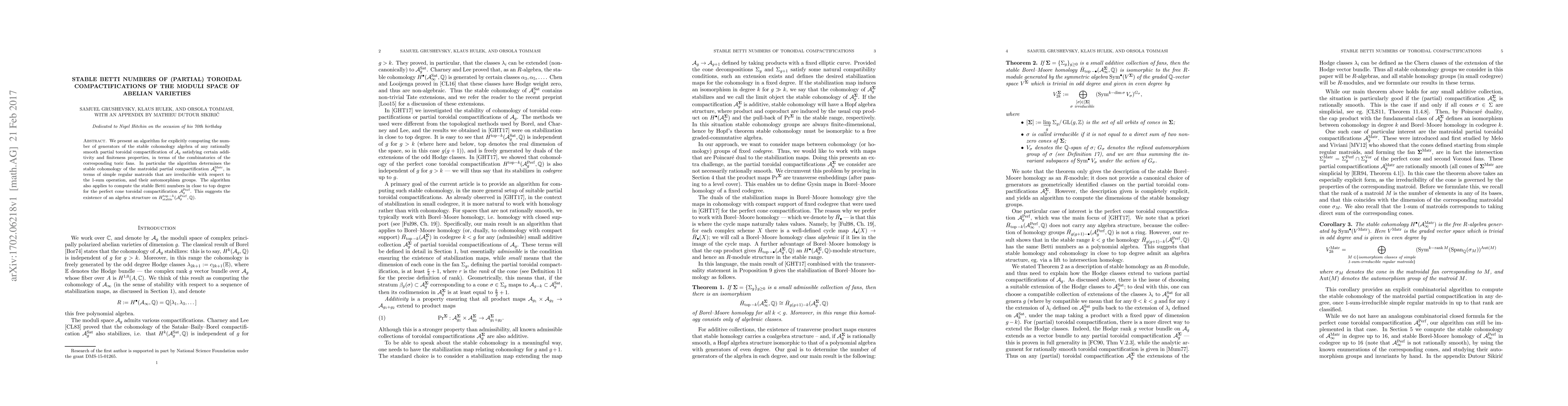 We present an algorithm for explicitly computing the number of generators of the stable cohomology algebra of any rationally smooth partial toroidal compactification of ${\mathcal A}_g$, satisfying certain additivity and finiteness properties, in terms of the combinatorics of the corresponding toric fans. In particular the algorithm determines the stable cohomology of the matroidal partial compactification, in terms of simple regular matroids that are irreducible with respect to the 1-sum operation, and their automorphism groups. The algorithm also applies to compute the stable Betti numbers in close to top degree for the perfect cone toroidal compactification. This suggests the existence of an algebra structure on the stable cohomology of the perfect cone compactification in close to top degree.
