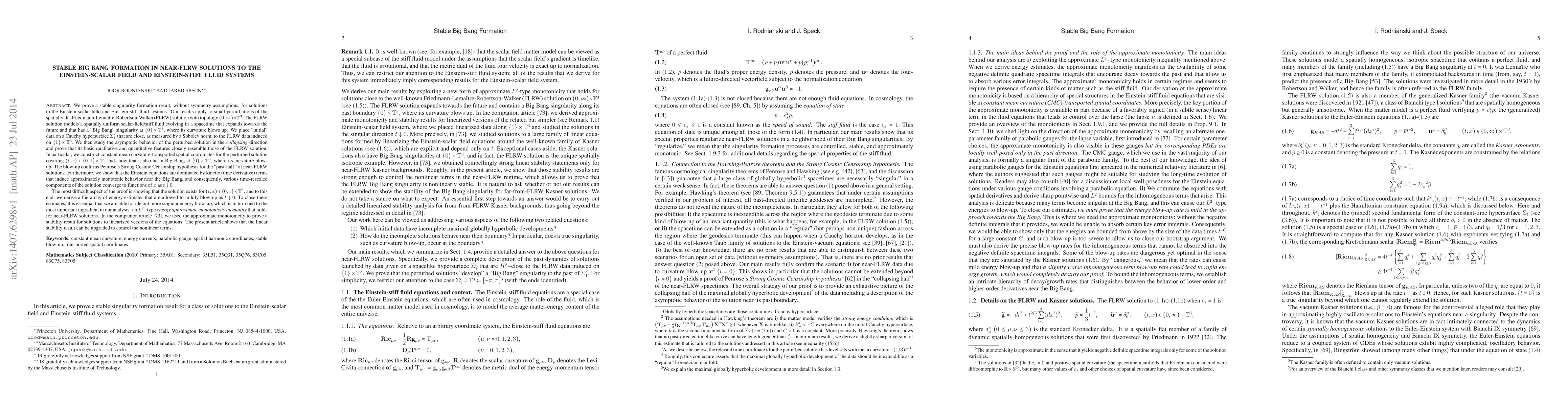We prove a stable singularity formation result for solutions to the Einstein-scalar field and Einstein-stiff fluid systems. Our results apply to small perturbations of the spatially flat FLRW solution with topology $(0,\infty) \times \mathbb{T}^3.$ The FLRW solution models a spatially uniform scalar-field/stiff fluid evolving in a spacetime that expands towards the future and that has a "Big Bang" singularity at $\lbrace 0 \rbrace \times \mathbb{T}^3,$ where its curvature blows up. We place data on a Cauchy hypersurface $\Sigma_1'$ that are close to the FLRW data induced on $\lbrace 1 \rbrace \times \mathbb{T}^3.$ We study the perturbed solution in the collapsing direction and prove that its basic features closely resemble those of the FLRW solution. In particular, we construct constant mean curvature-transported spatial coordinates for the perturbed solution covering $(t,x) \in (0,1] \times \mathbb{T}^3$ and show that it also has a Big Bang at $\lbrace 0 \rbrace \times \mathbb{T}^3,$ where its curvature blows up. The blow-up confirms Penrose's Strong Cosmic Censorship hypothesis for the "past-half" of near-FLRW solutions. The most difficult aspect of the proof is showing that the solution exists for $(t,x) \in (0,1] \times \mathbb{T}^3,$ and to this end, we derive energy estimates that are allowed to mildly blow-up as $t \downarrow 0.$ To close these estimates, we use the most important ingredient in our analysis: an $L^2-$type energy approximate monotonicity inequality that holds for near-FLRW solutions. In the companion article "A regime of linear stability for the Einstein-scalar field system with applications to nonlinear Big Bang formation," we used the approximate monotonicity to prove a stability result for solutions to linearized versions of the equations. The present article shows that the linear stability result can be upgraded to control the nonlinear terms.