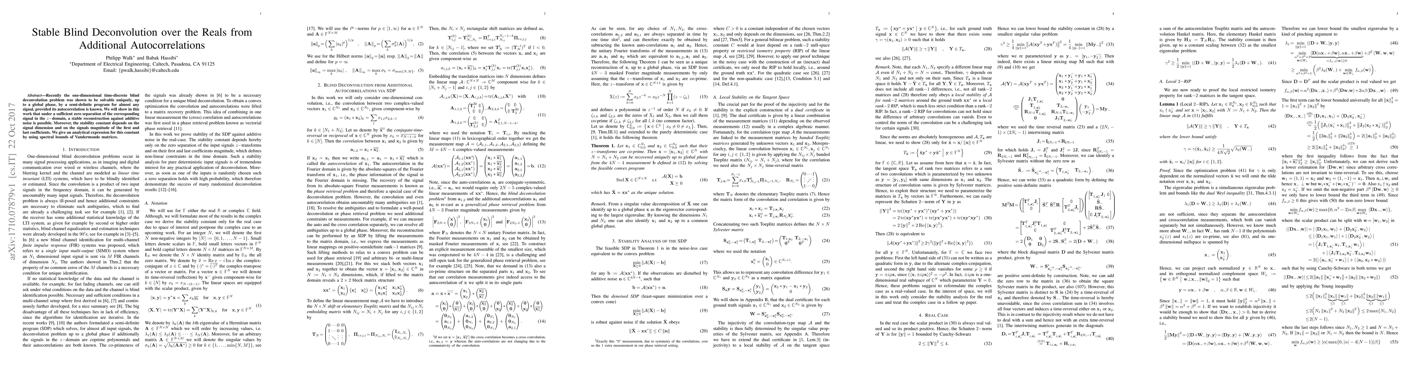 Recently the one-dimensional time-discrete blind deconvolution problem was shown to be solvable uniquely, up to a global phase, by a semi-definite program for almost any signal, provided its autocorrelation is known. We will show in this work that under a sufficient zero separation of the corresponding signal in the $z-$domain, a stable reconstruction against additive noise is possible. Moreover, the stability constant depends on the signal dimension and on the signals magnitude of the first and last coefficients. We give an analytical expression for this constant by using spectral bounds of Vandermonde matrices.
