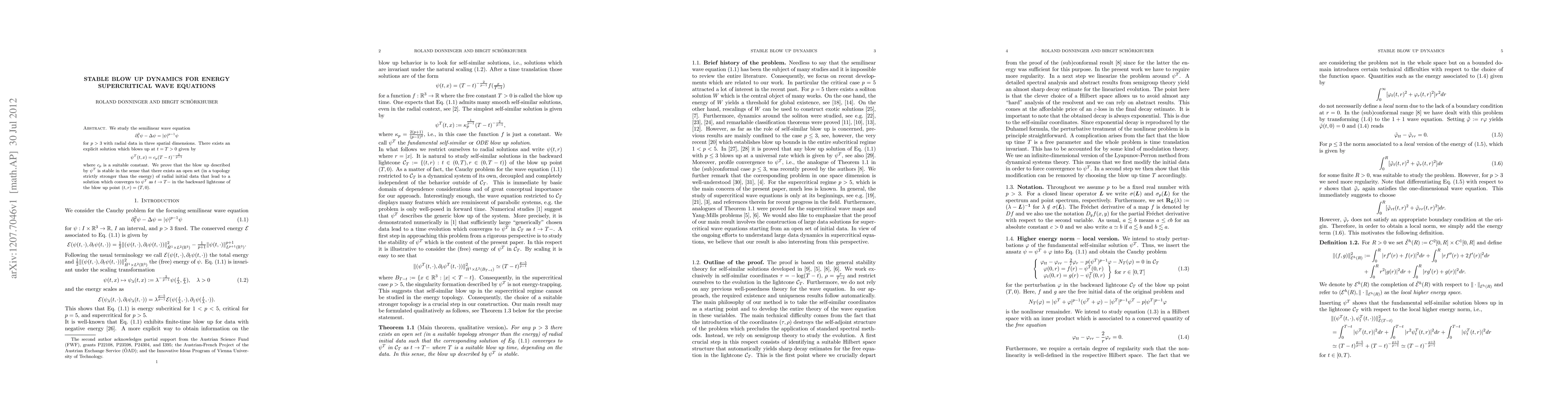 We study the semilinear wave equation \[ \partial_t^2 \psi-\Delta \psi=|\psi|^{p-1}\psi \] for $p > 3$ with radial data in three spatial dimensions. There exists an explicit solution which blows up at $t=T>0$ given by \[ \psi^T(t,x)=c_p (T-t)^{-\frac{2}{p-1}} \] where $c_p$ is a suitable constant. We prove that the blow up described by $\psi^T$ is stable in the sense that there exists an open set (in a topology strictly stronger than the energy) of radial initial data that lead to a solution which converges to $\psi^T$ as $t\to T-$ in the backward lightcone of the blow up point $(t,r)=(T,0)$.