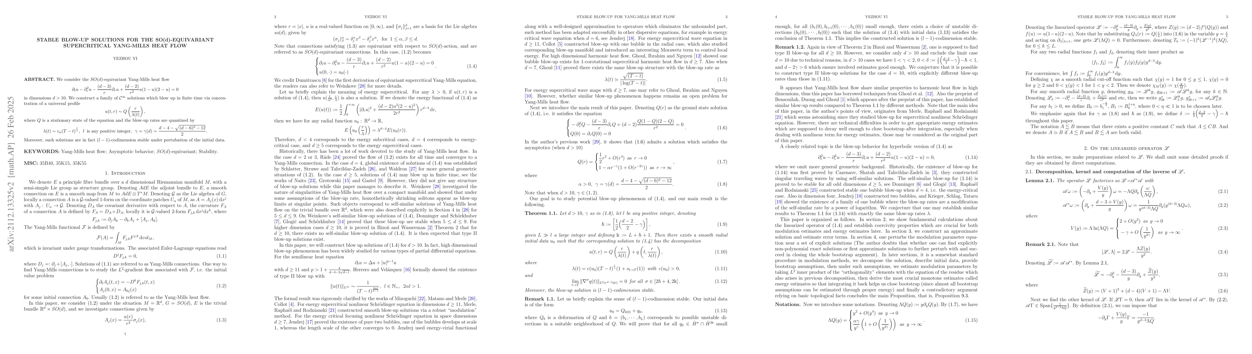 This paper constructs stable blow-up solutions for the $SO(d)$-equivariant supercritical Yang-Mills heat flow in dimensions $d>10$, showing that these solutions concentrate around a universal profile and exhibit quantized blow-up rates. The solutions are $(l-1)$-codimension stable under perturbations, with $l=1$ indicating a stable blow-up regime.