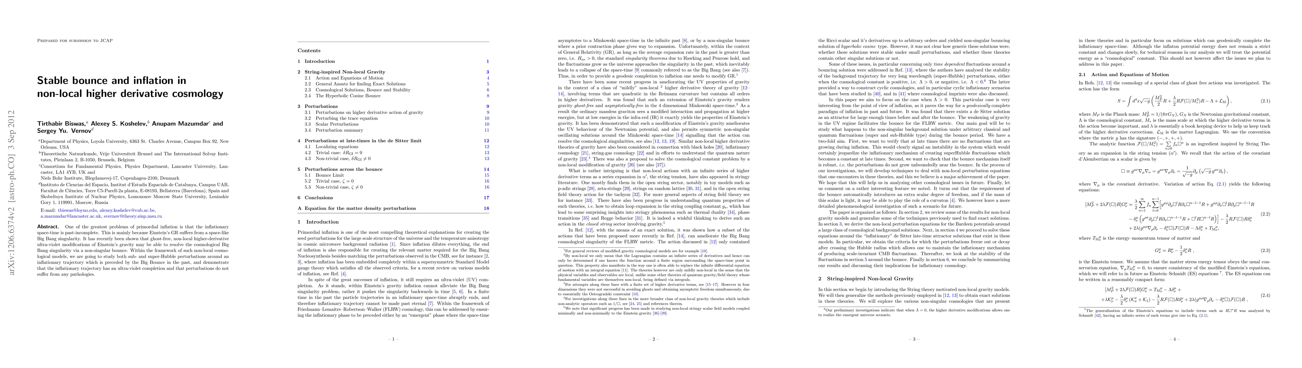 This paper explores how non-local higher-derivative modifications of Einstein's gravity can resolve the cosmological Big Bang singularity through a non-singular bounce, enabling stable inflation and demonstrating that perturbations around the inflationary trajectory remain well-behaved.