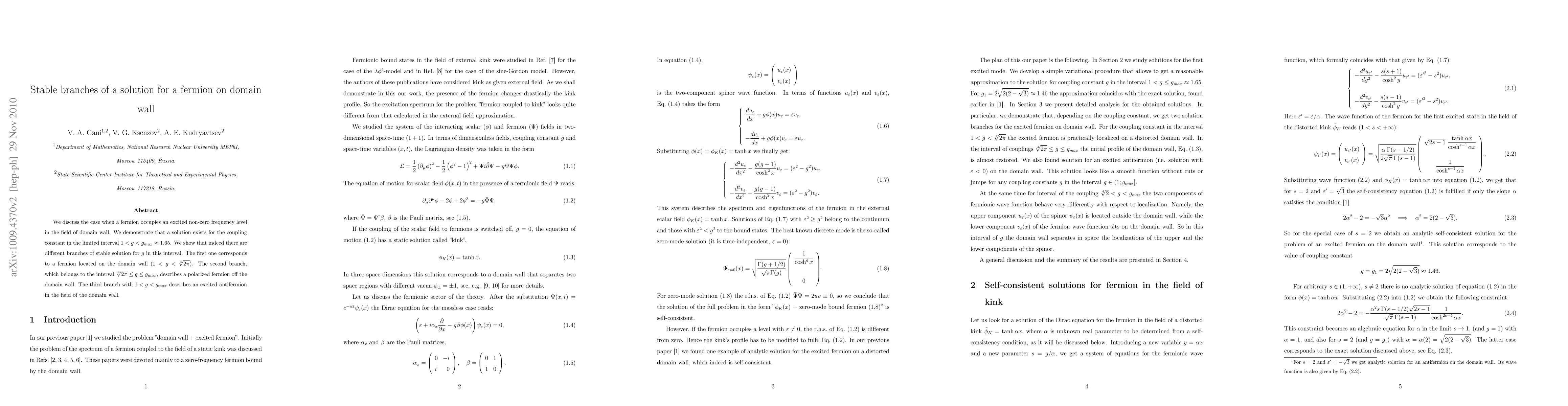 Researchers found stable solutions for a fermion in a domain wall's field within a specific range of coupling constants ($1<g<g_{max}$), leading to multiple branches describing different fermion configurations: on or off the wall.